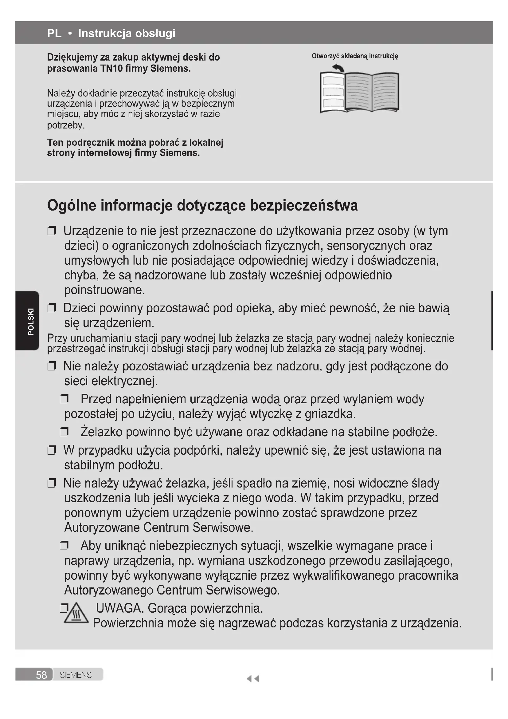 UWAGA. Gorąca powierzchnia. Powierzchnia może się nagrzewać podczas korzystania z urządzenia. PL • Instrukcja obsługi Dziękujemy za zakup aktywnej deski do prasowania TN10 rmy Siemens. Należy dokładnie przeczytać instrukcję obsługi urządzenia i przechowywać ją w bezpiecznym miejscu, aby móc z niej skorzystać w razie potrzeby. Ten podręcznik można pobrać z lokalnej strony internetowej rmy Siemens.59 S I E M E N S polSkI Ważne uwagi
