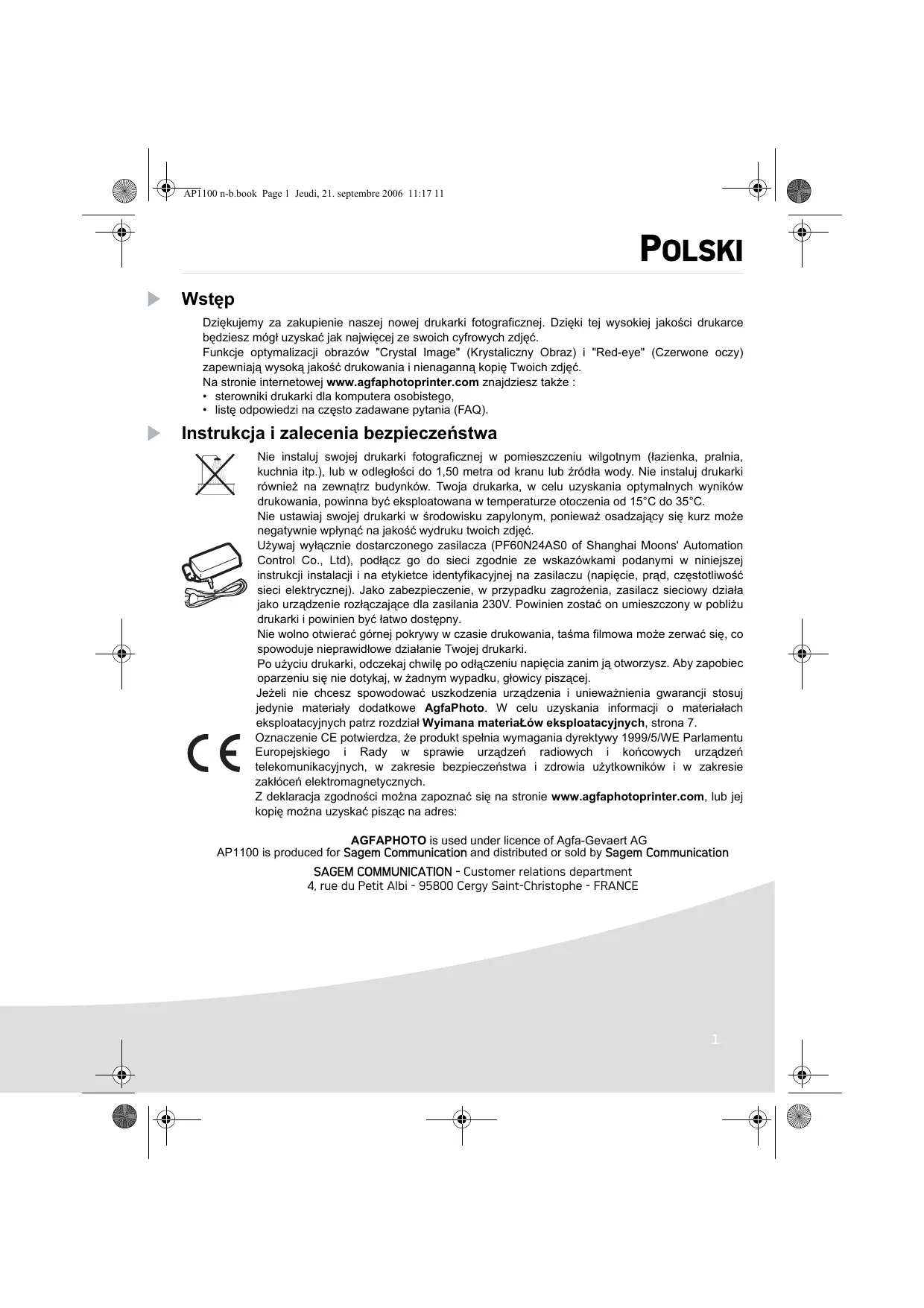 Ne pas installer votre imprimante photo ni dans une pièce humide (salle d'eau, salle de bain, buanderie, cuisine, etc..) à moins de 1,50 m d'un point d'eau ni en extérieur. Votre imprimante doit être utilisée à une température ambiante comprise entre 15 °C et 35 °C pour un rendu d’impression optimal. Ne pas installer votre imprimante dans un endroit poussiéreux, ces poussières pourraient dégrader la qualité d’impression de vos photos. Utilisez exclusivement le bloc secteur fourni (PF60N24AS0 of Shanghai Moons' Automation Control Co., Ltd), raccordez celui-ci sur le secteur conformément aux instructions d'installation de ce livret et aux indications portées sur l'étiquette d'identification apposée sur celui-ci (tension, courant, fréquence du réseau électrique). Par précaution, en cas de danger, les adaptateurs secteur servent de dispositif de sectionnement de l'alimentation 230 V. Ils doivent être situés à proximité de l'appareil et être aisément accessibles. Ne jamais ouvrir le capot supérieur en cours d'impression, vous risquez la rupture du film et par la suite un dysfonctionnement de votre imprimante. Après l’utilisation de l’imprimante, attendez quelques instants après la mise hors tension de l’imprimante avant de l’ouvrir. Pour éviter toute blessure, ne touchez en aucun cas la tête d’impression. Utilisez seulement les consommables de marque AgfaPhoto et exclusivement ceux-ci sinon vous risquez d'endommager l'appareil et de perdre la garantie. Pour connaître les références des consommables reportez-vous au paragraphe Consommables, page 7. Le marquage CE atteste de la conformité du produit aux exigences essentielles de la directive 1999/5/CE du Parlement et du Conseil Européen concernant les équipements terminaux de télécommunication, pour la sécurité et la santé des usagers, pour les perturbations électromagnétiques. La déclaration de conformité peut être consultée sur le site www.agfaphotoprinter.com ou peut être demandée à l'adresse suivante: AGFAPHOTO is used under licence of Agfa-Gevaert AG AP1100 is produced for Sagem Communication and distributed or sold by Sagem Communication SAGEM COMMUNICATION - Customer relations department Pour faciliter ce recyclage, veuillez respecter les règles de tri mises en place localement pour ce type de déchets. LES PILES ET BATTERIES Si votre produit contient des piles ou des batteries, ces dernières doivent être déposées dans les points de collecte désignés. LE PRODUIT La poubelle barrée apposée sur le produit ou ses accessoires signifie qu'ils appartiennent à la famille des équipements électriques et électroniques. A ce titre, la réglementation européenne vous demande de procéder à sa collecte sélective : - dans les points de distribution en cas d'achat d'un équipement équivalent, - dans les points de collecte mis à votre disposition localement (déchetterie, collecte sélective, etc.). Ainsi, vous participez à la réutilisation et à la valorisation des Déchets d'Equipement Electriques et Electroniques qui peuvent avoir des effets potentiels sur l'environnement et la santé humaine.