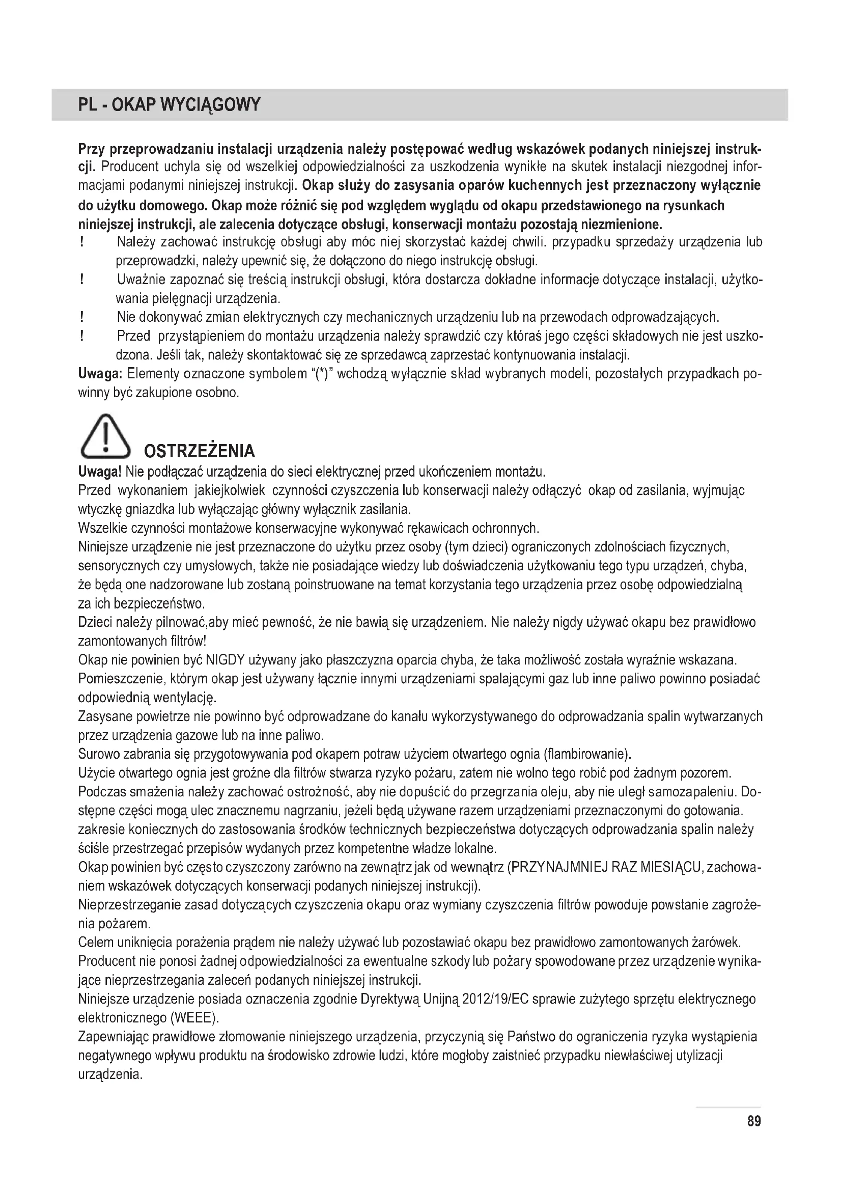 Przy przeprowadzaniu instalacji urządzenia należy postępować według wskazówek podanych niniejszej instruk- cji. Producent uchyla się od wszelkiej odpowiedzialności za uszkodzenia wynikłe na skutek instalacji niezgodnej infor- macjami podanymi niniejszej instrukcji. Okap służy do zasysania oparów kuchennych jest przeznaczony wyłącznie do użytku domowego. Okap może różnić się pod względem wyglądu od okapu przedstawionego na rysunkach niniejszej instrukcji, ale zalecenia dotyczące obsługi, konserwacji montażu pozostają niezmienione. ! Należy zachować instrukcję obsługi aby móc niej skorzystać każdej chwili. przypadku sprzedaży urządzenia lub przeprowadzki, należy upewnić się, że dołączono do niego instrukcję obsługi. ! Uważnie zapoznać się treścią instrukcji obsługi, która dostarcza dokładne informacje dotyczące instalacji, użytko- wania pielęgnacji urządzenia. ! Nie dokonywać zmian elektrycznych czy mechanicznych urządzeniu lub na przewodach odprowadzających. ! Przed przystąpieniem do montażu urządzenia należy sprawdzić czy któraś jego części składowych nie jest uszko- dzona. Jeśli tak, należy skontaktować się ze sprzedawcą zaprzestać kontynuowania instalacji. Uwaga: Elementy oznaczone symbolem “(*)” wchodzą wyłącznie skład wybranych modeli, pozostałych przypadkach po- winny być zakupione osobno. OSTRZEŻENIA Uwaga! Nie podłączać urządzenia do sieci elektrycznej przed ukończeniem montażu. Przed wykonaniem jakiejkolwiek czynności czyszczenia lub konserwacji należy odłączyć okap od zasilania, wyjmując wtyczkę gniazdka lub wyłączając główny wyłącznik zasilania. Wszelkie czynności montażowe konserwacyjne wykonywać rękawicach ochronnych. Niniejsze urządzenie nie jest przeznaczone do użytku przez osoby (tym dzieci) ograniczonych zdolnościach zycznych, sensorycznych czy umysłowych, także nie posiadające wiedzy lub doświadczenia użytkowaniu tego typu urządzeń, chyba, że będą one nadzorowane lub zostaną poinstruowane na temat korzystania tego urządzenia przez osobę odpowiedzialną za ich bezpieczeństwo. Dzieci należy pilnować,aby mieć pewność, że nie bawią się urządzeniem. Nie należy nigdy używać okapu bez prawidłowo zamontowanych ltrów! Okap nie powinien być NIGDY używany jako płaszczyzna oparcia chyba, że taka możliwość została wyraźnie wskazana. Pomieszczenie, którym okap jest używany łącznie innymi urządzeniami spalającymi gaz lub inne paliwo powinno posiadać odpowiednią wentylację. Zasysane powietrze nie powinno być odprowadzane do kanału wykorzystywanego do odprowadzania spalin wytwarzanych przez urządzenia gazowe lub na inne paliwo. Surowo zabrania się przygotowywania pod okapem potraw użyciem otwartego ognia (ambirowanie). Użycie otwartego ognia jest groźne dla ltrów stwarza ryzyko pożaru, zatem nie wolno tego robić pod żadnym pozorem. Podczas smażenia należy zachować ostrożność, aby nie dopuścić do przegrzania oleju, aby nie uległ samozapaleniu. Do- stępne części mogą ulec znacznemu nagrzaniu, jeżeli będą używane razem urządzeniami przeznaczonymi do gotowania. zakresie koniecznych do zastosowania środków technicznych bezpieczeństwa dotyczących odprowadzania spalin należy ściśle przestrzegać przepisów wydanych przez kompetentne władze lokalne. Okap powinien być często czyszczony zarówno na zewnątrz jak od wewnątrz (PRZYNAJMNIEJ RAZ MIESIĄCU, zachowa- niem wskazówek dotyczących konserwacji podanych niniejszej instrukcji). Nieprzestrzeganie zasad dotyczących czyszczenia okapu oraz wymiany czyszczenia ltrów powoduje powstanie zagroże- nia pożarem. Celem uniknięcia porażenia prądem nie należy używać lub pozostawiać okapu bez prawidłowo zamontowanych żarówek. Producent nie ponosi żadnej odpowiedzialności za ewentualne szkody lub pożary spowodowane przez urządzenie wynika- jące nieprzestrzegania zaleceń podanych niniejszej instrukcji. Niniejsze urządzenie posiada oznaczenia zgodnie Dyrektywą Unijną 2012/19/EC sprawie zużytego sprzętu elektrycznego elektronicznego (WEEE). Zapewniając prawidłowe złomowanie niniejszego urządzenia, przyczynią się Państwo do ograniczenia ryzyka wystąpienia negatywnego wpływu produktu na środowisko zdrowie ludzi, które mogłoby zaistnieć przypadku niewłaściwej utylizacji urządzenia.90 S y m b o l na urządzeniu lub opakowaniu oznacza, że tego produktu nie można traktować jak innych odpadów komunalnych. Należy oddać go do właściwego punktu zbiórki recyklingu sprzętów elektrycznych elektronicznych. Właściwa utylizacja złomowanie pomaga eliminacji niekorzystnego wpływu złomowanych urządzeń na środowisko oraz zdrowie. Aby uzyskać szczegółowe dane dotyczące możliwości recyklingu niniejszego urządzenia, należy skontaktować się lokalnym urzędem miasta, służbami oczyszczania miasta lub sklepem, którym produkt został zakupiony. Urządzenie zostało zaprojektowane, przetestowane wyprodukowane zgodnie następującymi warunkami: