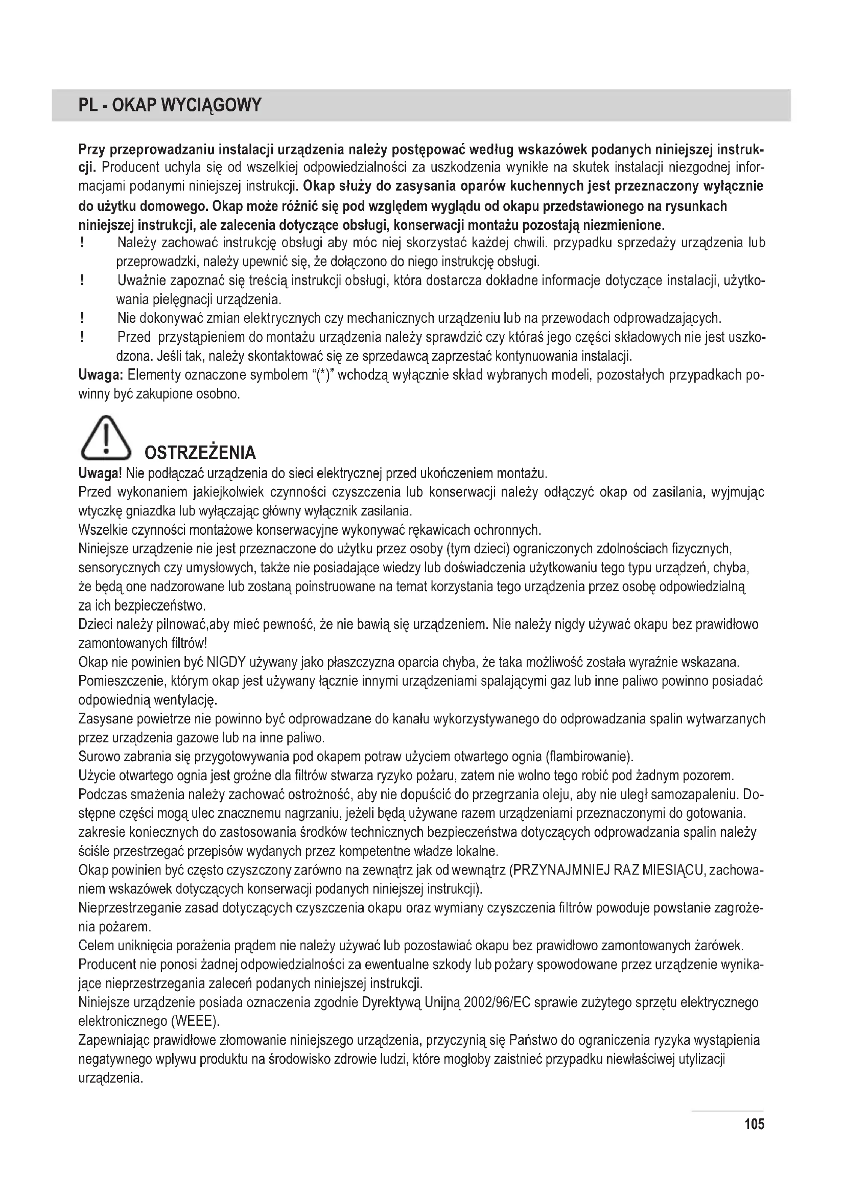 Przy przeprowadzaniu instalacji urządzenia należy postępować według wskazówek podanych niniejszej instruk- cji. Producent uchyla się od wszelkiej odpowiedzialności za uszkodzenia wynikłe na skutek instalacji niezgodnej infor- macjami podanymi niniejszej instrukcji. Okap służy do zasysania oparów kuchennych jest przeznaczony wyłącznie do użytku domowego. Okap może różnić się pod względem wyglądu od okapu przedstawionego na rysunkach niniejszej instrukcji, ale zalecenia dotyczące obsługi, konserwacji montażu pozostają niezmienione. ! Należy zachować instrukcję obsługi aby móc niej skorzystać każdej chwili. przypadku sprzedaży urządzenia lub przeprowadzki, należy upewnić się, że dołączono do niego instrukcję obsługi. ! Uważnie zapoznać się treścią instrukcji obsługi, która dostarcza dokładne informacje dotyczące instalacji, użytko- wania pielęgnacji urządzenia. ! Nie dokonywać zmian elektrycznych czy mechanicznych urządzeniu lub na przewodach odprowadzających. ! Przed przystąpieniem do montażu urządzenia należy sprawdzić czy któraś jego części składowych nie jest uszko- dzona. Jeśli tak, należy skontaktować się ze sprzedawcą zaprzestać kontynuowania instalacji. Uwaga: Elementy oznaczone symbolem “(*)” wchodzą wyłącznie skład wybranych modeli, pozostałych przypadkach po- winny być zakupione osobno. OSTRZEŻENIA Uwaga! Nie podłączać urządzenia do sieci elektrycznej przed ukończeniem montażu. Przed wykonaniem jakiejkolwiek czynności czyszczenia lub konserwacji należy odłączyć okap od zasilania, wyjmując wtyczkę gniazdka lub wyłączając główny wyłącznik zasilania. Wszelkie czynności montażowe konserwacyjne wykonywać rękawicach ochronnych. Niniejsze urządzenie nie jest przeznaczone do użytku przez osoby (tym dzieci) ograniczonych zdolnościach zycznych, sensorycznych czy umysłowych, także nie posiadające wiedzy lub doświadczenia użytkowaniu tego typu urządzeń, chyba, że będą one nadzorowane lub zostaną poinstruowane na temat korzystania tego urządzenia przez osobę odpowiedzialną za ich bezpieczeństwo. Dzieci należy pilnować,aby mieć pewność, że nie bawią się urządzeniem. Nie należy nigdy używać okapu bez prawidłowo zamontowanych ltrów! Okap nie powinien być NIGDY używany jako płaszczyzna oparcia chyba, że taka możliwość została wyraźnie wskazana. Pomieszczenie, którym okap jest używany łącznie innymi urządzeniami spalającymi gaz lub inne paliwo powinno posiadać odpowiednią wentylację. Zasysane powietrze nie powinno być odprowadzane do kanału wykorzystywanego do odprowadzania spalin wytwarzanych przez urządzenia gazowe lub na inne paliwo. Surowo zabrania się przygotowywania pod okapem potraw użyciem otwartego ognia (ambirowanie). Użycie otwartego ognia jest groźne dla ltrów stwarza ryzyko pożaru, zatem nie wolno tego robić pod żadnym pozorem. Podczas smażenia należy zachować ostrożność, aby nie dopuścić do przegrzania oleju, aby nie uległ samozapaleniu. Do- stępne części mogą ulec znacznemu nagrzaniu, jeżeli będą używane razem urządzeniami przeznaczonymi do gotowania. zakresie koniecznych do zastosowania środków technicznych bezpieczeństwa dotyczących odprowadzania spalin należy ściśle przestrzegać przepisów wydanych przez kompetentne władze lokalne. Okap powinien być często czyszczony zarówno na zewnątrz jak od wewnątrz (PRZYNAJMNIEJ RAZ MIESIĄCU, zachowa- niem wskazówek dotyczących konserwacji podanych niniejszej instrukcji). Nieprzestrzeganie zasad dotyczących czyszczenia okapu oraz wymiany czyszczenia ltrów powoduje powstanie zagroże- nia pożarem. Celem uniknięcia porażenia prądem nie należy używać lub pozostawiać okapu bez prawidłowo zamontowanych żarówek. Producent nie ponosi żadnej odpowiedzialności za ewentualne szkody lub pożary spowodowane przez urządzenie wynika- jące nieprzestrzegania zaleceń podanych niniejszej instrukcji. Niniejsze urządzenie posiada oznaczenia zgodnie Dyrektywą Unijną 2002/96/EC sprawie zużytego sprzętu elektrycznego elektronicznego (WEEE). Zapewniając prawidłowe złomowanie niniejszego urządzenia, przyczynią się Państwo do ograniczenia ryzyka wystąpienia negatywnego wpływu produktu na środowisko zdrowie ludzi, które mogłoby zaistnieć przypadku niewłaściwej utylizacji urządzenia.106 S y m b o l na urządzeniu lub opakowaniu oznacza, że tego produktu nie można traktować jak innych odpadów komunalnych. Należy oddać go do właściwego punktu zbiórki recyklingu sprzętów elektrycznych elektronicznych. Właściwa utylizacja złomowanie pomaga eliminacji niekorzystnego wpływu złomowanych urządzeń na środowisko oraz zdrowie. Aby uzyskać szczegółowe dane dotyczące możliwości recyklingu niniejszego urządzenia, należy skontaktować się lokalnym urzędem miasta, służbami oczyszczania miasta lub sklepem, którym produkt został zakupiony. Urządzenie zostało zaprojektowane, przetestowane wyprodukowane zgodnie następującymi warunkami: