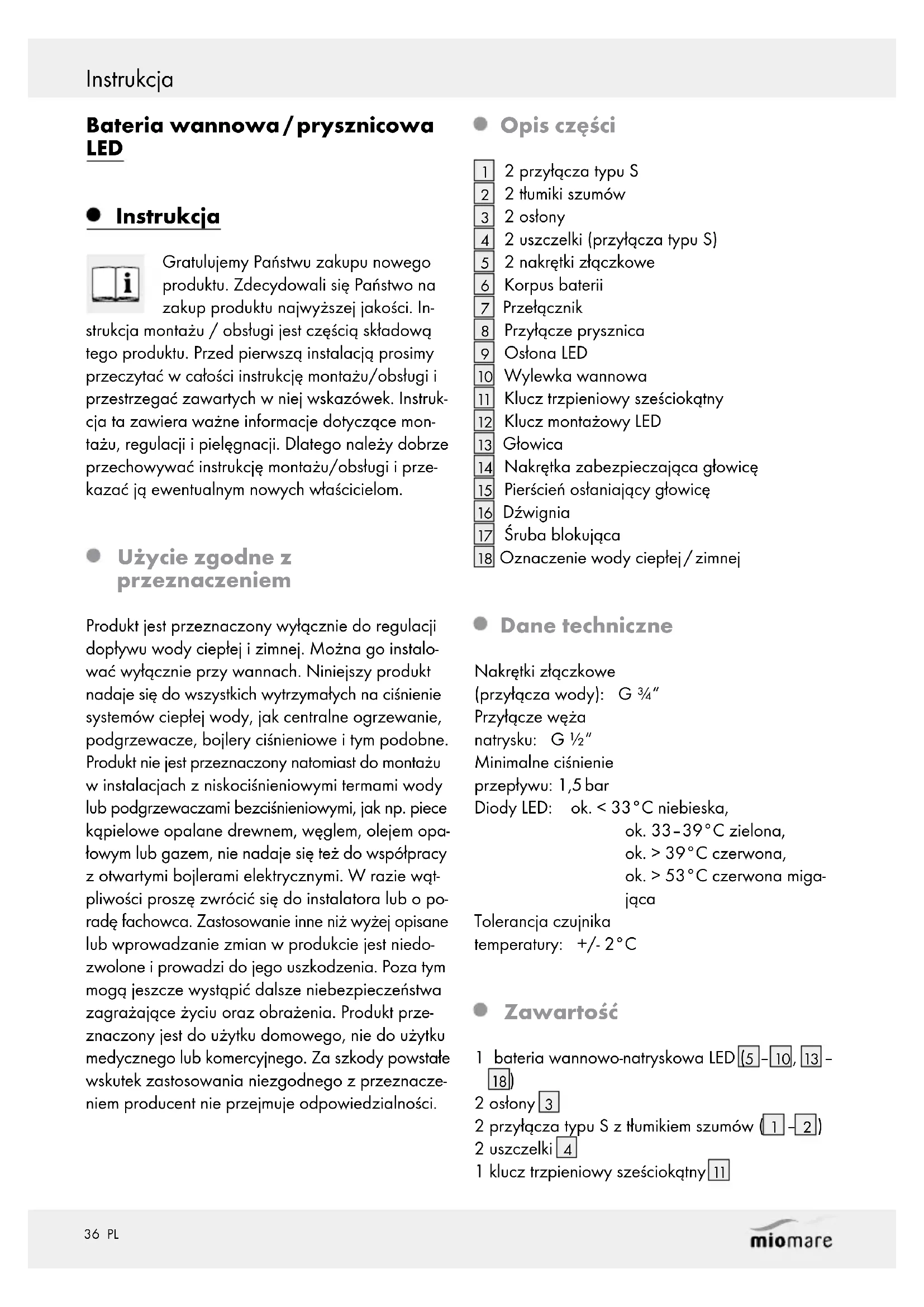 Oznaczenie wody ciepłej / zimnej Dane techniczne Nakrętki złączkowe (przyłącza wody): G ¾“ Przyłącze węża natrysku: G ½“ Minimalne ciśnienie przepływu: 1,5 bar Diody LED: ok. < 33°C niebieska, ok. 33–39°C zielona, ok. > 39°C czerwona, ok. > 53°C czerwona miga- jąca Tolerancja czujnika temperatury: +/- 2°C Zawartość 1 bateria wannowo-natryskowa LED (