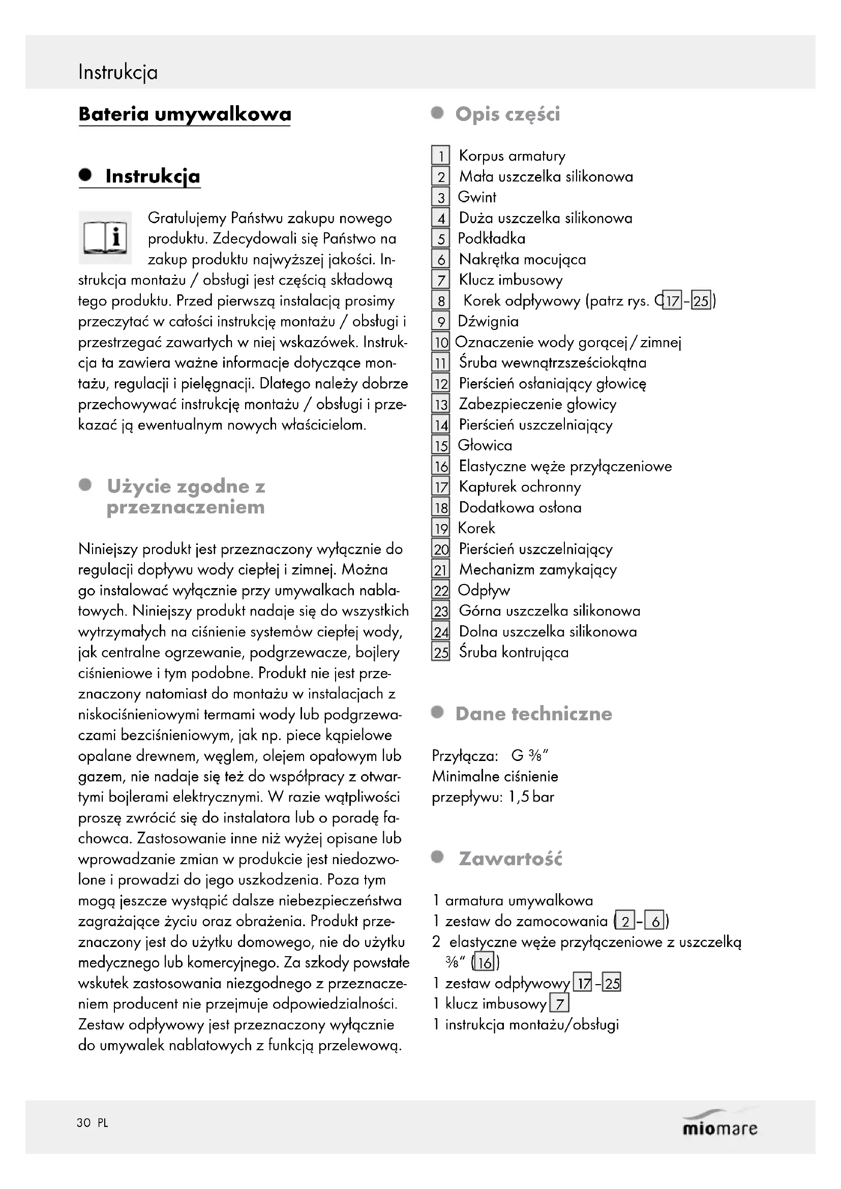 SIĘ! Podczas regulacji ciepłej wody należy zwrócić uwagę na to, aby temperatura wody nie została nastawiona na zbyt wysoką. NIEBEZPIECZEŃ- STWO OPARZENIA SIĘ! Gorąca stojąca woda w umywalce może prowadzić do popa- rzenia się ukropem. Przed użyciem zestawu odpływowego należy schłodzić wodę. OSTROŻNIE! Upewnić się, że oznaczenia wody ciepłej / zimnej są prawidłowo założone. Prawidłowy układ wygląda następująco: strona lewa = czerwony (ciepła woda), strona prawa = niebieski (zimna woda). Należy mieć na uwadze, że uszczelki są częściami zużywającymi się i należy od czasu do czasu dokonać ich wymiany. Nieszczelności lub wylew wody mogą prowadzić do poważnych szkód rzeczowych w budynku lub sprzętach domowych. Dlatego należy dokładanie sprawdzić wszystkie połą- czenia pod kątem szczelności. Przed zainstalowaniem proszę zapoznać się ze wszystkimi warunkami panującymi w miejscu zainstalowania, np. przyłącza wody i urządze- nie odcinające dopływ wody. Produkt nadaje się do użytku wyłącznie w po- mieszczeniach, w których panuje temperatura powyżej 0°C. Montaż Wskazówka: przed rozpoczęciem montażu należy zapoznać się z produktem. W tym celu należy uważnie przeczytać instrukcję montażu i wskazówki dotyczące bezpieczeństwa. W przy- padku nieprawidłowego montażu gwarancja ulega unieważnieniu. W szczególności dotyczy to odpowiedzialności za szkody pośrednie. OSTROŻNIE! Przed instalacją należy zakręcić główny zawór na dopływie wody. W przeciw- nym wypadku występuje ryzyko odniesienia obrażeń i/lub powstania szkód materialnych. OSTROŻNIE! Nie skręcać i nie naprężać elastycznych węży przyłączeniowych