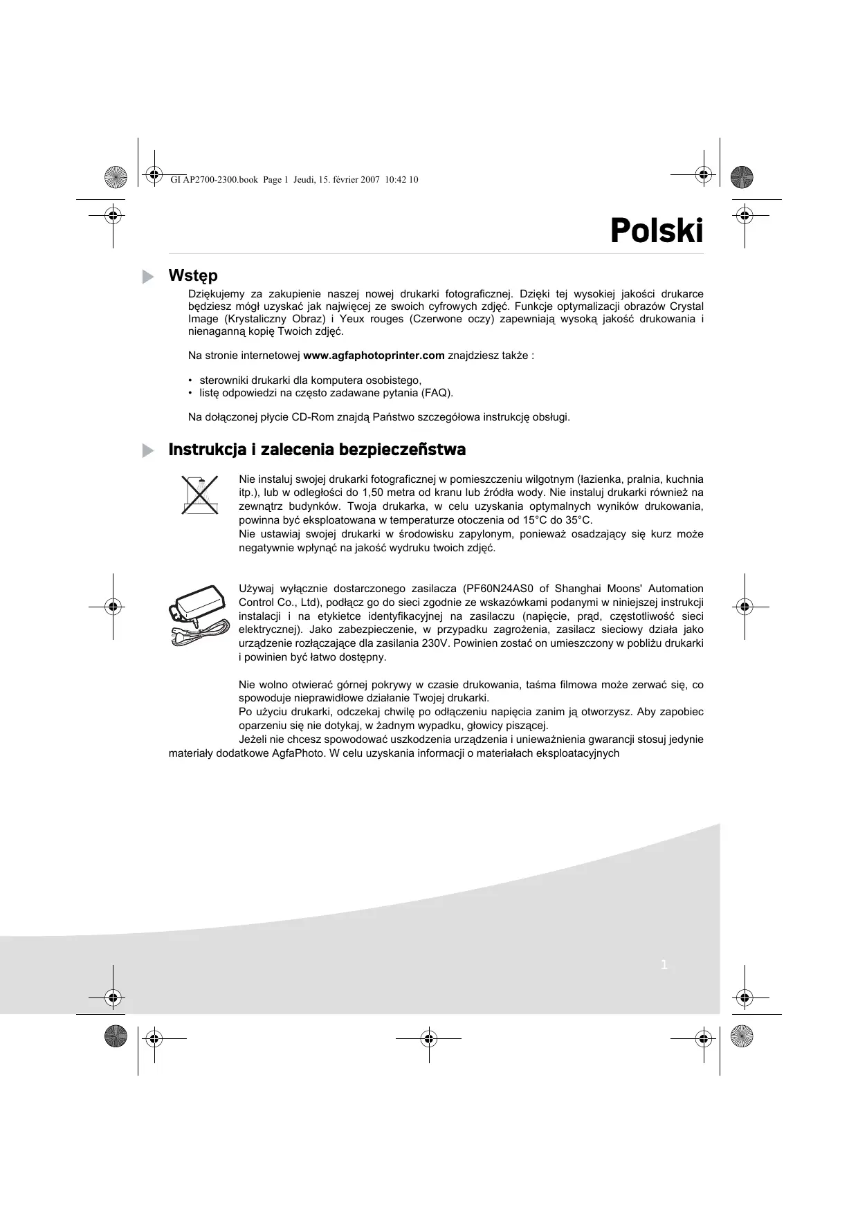 Ne pas installer votre imprimante photo ni dans une pièce humide (salle d'eau, salle de bain, buanderie, cuisine, etc..) à moins de 1,50 m d'un point d'eau ni en extérieur. Votre imprimante doit être utilisée à une température ambiante comprise entre 15 °C et 35 °C pour un rendu d’impression optimal. Ne pas installer votre imprimante dans un endroit poussiéreux, ces poussières pourraient dégrader la qualité d’impression de vos photos. Utilisez exclusivement le bloc secteur fourni (PF60N24AS0 of Shanghai Moons' Automation Control Co., Ltd), raccordez celui-ci sur le secteur conformément aux instructions d'installation de ce livret et aux indications portées sur l'étiquette d'identification apposée sur celui-ci (tension, courant, fréquence du réseau électrique). Par précaution, en cas de danger, les adaptateurs secteur servent de dispositif de sectionnement de l'alimentation 230 V. Ils doivent être situés à proximité de l'appareil et être aisément accessibles. Ne jamais ouvrir le capot supérieur en cours d'impression, vous risquez la rupture du film et par la suite un dysfonctionnement de votre imprimantAprès l’utilisation de l’imprimante, attendez quelques instants après la mise hors tension de l’imprimante avant de l’ouvrir. Pour éviter toute blessure, ne touchez en aucun cas la tête d’impression. Utilisez seulement les consommables de marque AgfaPhoto et exclusivement ceux-ci sinon vous risquez d'endommager l'appareil et de perdre la garantie. La poubelle barrée apposée sur le produit ou ses accessoires signifie qu'ils appartiennent à la famille des équipements électriques et électroniques. A ce titre, la réglementation européenne vous demande de procéder à sa collecte sélective : - dans les points de distribution en cas d'achat d'un équipement équivalent,