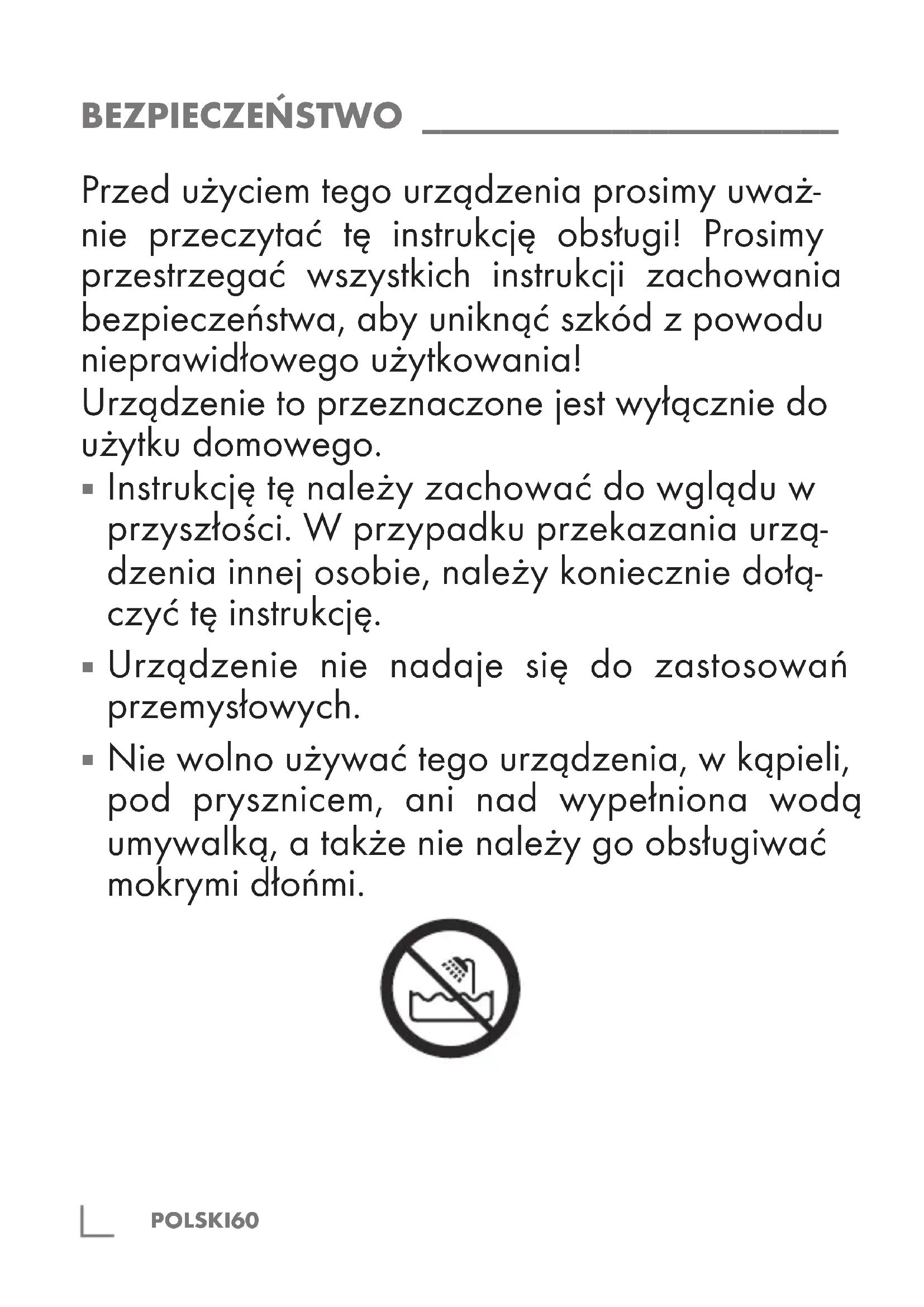 Nie wolno używać tego urządzenia, w kąpieli, pod prysznicem, ani nad wypełniona wodą umywalką, a także nie należy go obsługiwać mokrymi dłońmi.POLSKI