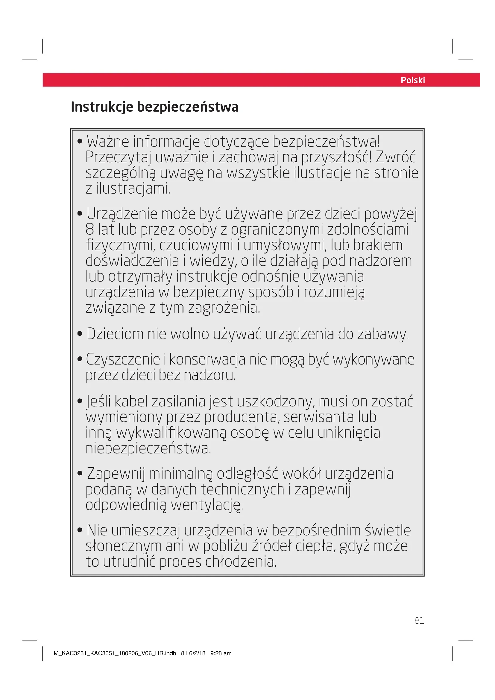 - Nie umieszczaj urządzenia w bezpośrednim świetle słonecznym ani w pobliżu źródeł ciepła, gdyż może to utrudnić proces chłodzenia. IM_KAC3231_KAC3351_180206_V06_HR.indb 81 6/2/18 9:28 amPolski