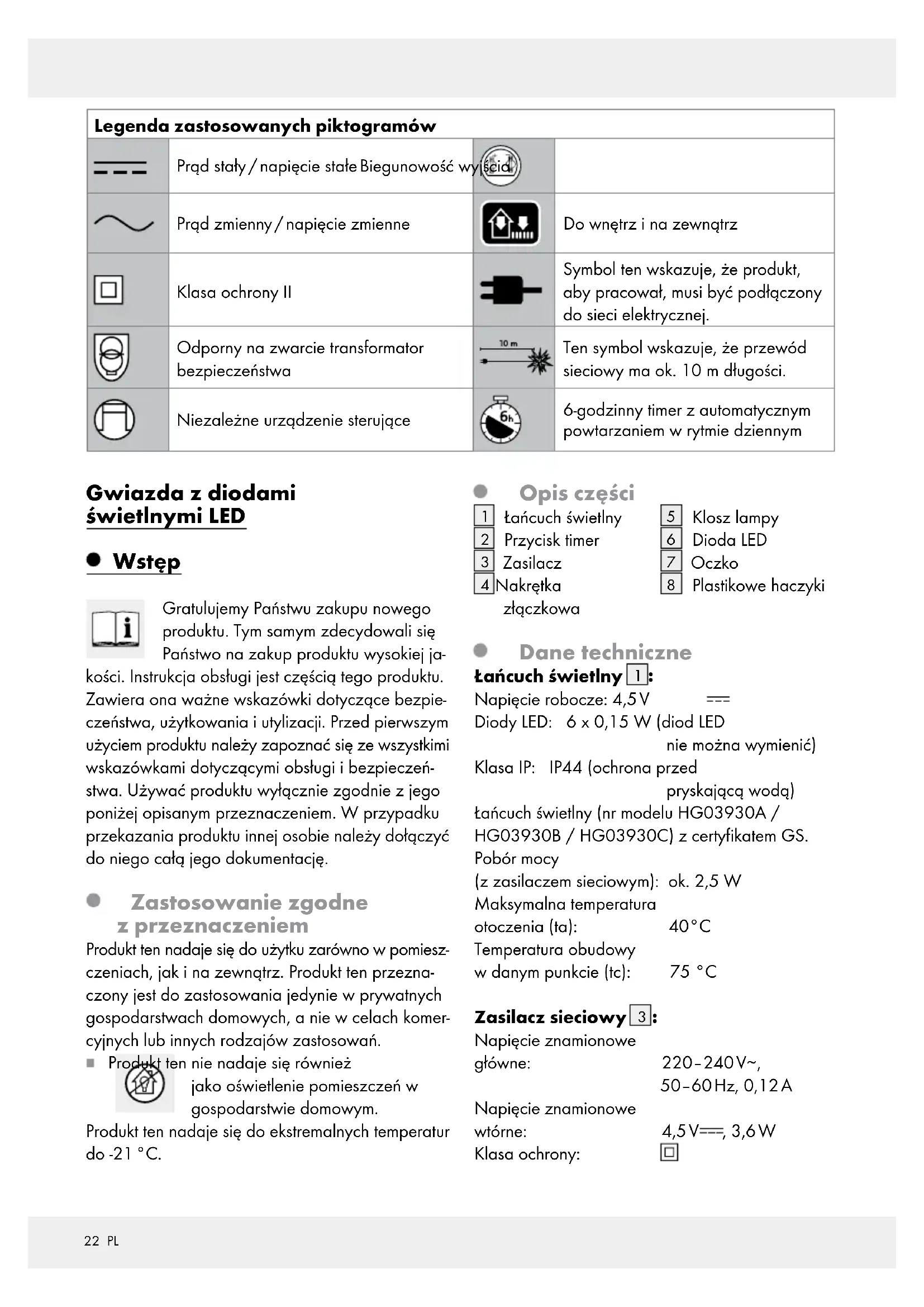 Przy segregowaniu odpadów prosimy zwrócić uwagę na oznakowanie mate- riałów opakowaniowych, oznaczone są one skrótami (a) i numerami (b) o nastę- pującym znaczeniu: 1–7: Tworzywa sztuczne / 20–22: Papier i tektura / 80– 98: Materiały kompozytowe. Produkt i materiał opakowania nadają się do ponownego przetworzenia, należy je zutylizować osobno w celu lepszego przetworzenia odpadów. Logo Triman jest ważne tylko dla Francji.25 PL Informacji na temat możliwości utylizacji wyeksploatowanego produktu udziela urząd gminy lub miasta. Z uwagi na ochronę środowiska nie wyrzucać urządzenia po zakończeniu eksploatacji do odpadów domowych, lecz prawidłowo zutylizować. Informacji o punktach zbiorczych i ich godzinach otwarcia udziela odpowiedni urząd. Gwarancja Produkt wyprodukowano według wysokich standar- dów jakości i poddano skrupulatnej kontroli przed wysyłką. W przypadku wad produktu nabywcy przysługują ustawowe prawa. Gwarancja nie ogranicza ustawowych praw nabywcy produktu. Produkt objęte jest 3 gwarancją, licząc od daty zakupu. Gwarancja wygasa w razie zawinionego przez użytkownika uszkodzenia produktu, niewła- ściwego użycia lub konserwacji. W przypadku wystąpienia w ciągu 3 lat od daty zakupu wad materiałowych lub fabrycznych, doko- nujemy – według własnej oceny – bezpłatnej na- prawy lub wymiany produktu. Świadczenie gwarancyjne obejmuje wady materia- łowe i fabryczne. Gwarancja nie obejmuje części produktu ulegających normalnemu zużyciu, uzna- wanych za części zużywalne (np. baterie) oraz uszkodzeń części łamliwych, np. przełączników, akumulatorów lub wykonanych ze szkła. Zgodnie z Kodeksem Cywilnym art. 581 §1 wraz z wymianą urządzenia lub ważnej części czas gwarancji rozpoczyna się na nowo. Sposób postępowania w przypadku naprawy gwarancyjnej Aby zapewnić szybkie rozpatrzenie Państwa wniosku, prosimy stosować się do następujących wskazówek: Przed skontaktowaniem się z działem serwisowym należy przygotować paragon i numer artykułu (np. IAN 123456_7890) jako dowód zakupu. Numery artykułów można znaleźć na tabliczce znamionowe, na grawerunku, na stronie tytułowej jego instrukcji (na dole po lewej stronie) lub jako naklejkę na stronie odwrotnej lub spodniej. W razie wystąpienia błędów w działaniu lub innych wad, należy skontaktować się najpierw z wymie- nionym poniżej działem serwisowym telefonicznie lub pocztą elektroniczną. Produkt uznany za uszkodzony można następnie z dołączeniem dowodu zakupu (paragonu) i podaniem, na czym polega wada i kiedy wystąpiła, przesłać bezpłatnie na podany Państwu adres serwisu. Serwis Serwis Polska Tel.: 008004911946 E-Mail: owim@lidl.pl26 CZ Legenda použitých piktogramů Stejnosměrný proud / stejnosměrné napětí Polarita přípojky výstupu Střídavý proud / střídavé napětí Pro vnitřní i venkovní prostory Ochranná třída II Tento symbol informuje otom, že výrobek musíte kprovozu připojit kelektrické síti. Bezpečnostní transformátor odolný proti zkratu Tento symbol informuje otom, že délka přívodního kabelu je cca 10m. Nezávislé provozní zařízení 6hodinový časovač s automatickým denním opakováním LED svíticí hvězda Úvod Blahopřejeme Vám ke koupi nového výrobku. Rozhodli jste se pro kvalitní produkt. Návod kobsluze je součástí tohoto výrobku. Obsahuje důležité pokyny pro bez- pečnost, použití a likvidaci. Před použitím výrobku se seznamte se všemi pokyny k obsluze a bezpeč- nostními pokyny. Používejte výrobek jen popsaným způsobem a na uvedených místech. Při předání vý- robku třetí osobě předejte i všechny podklady.