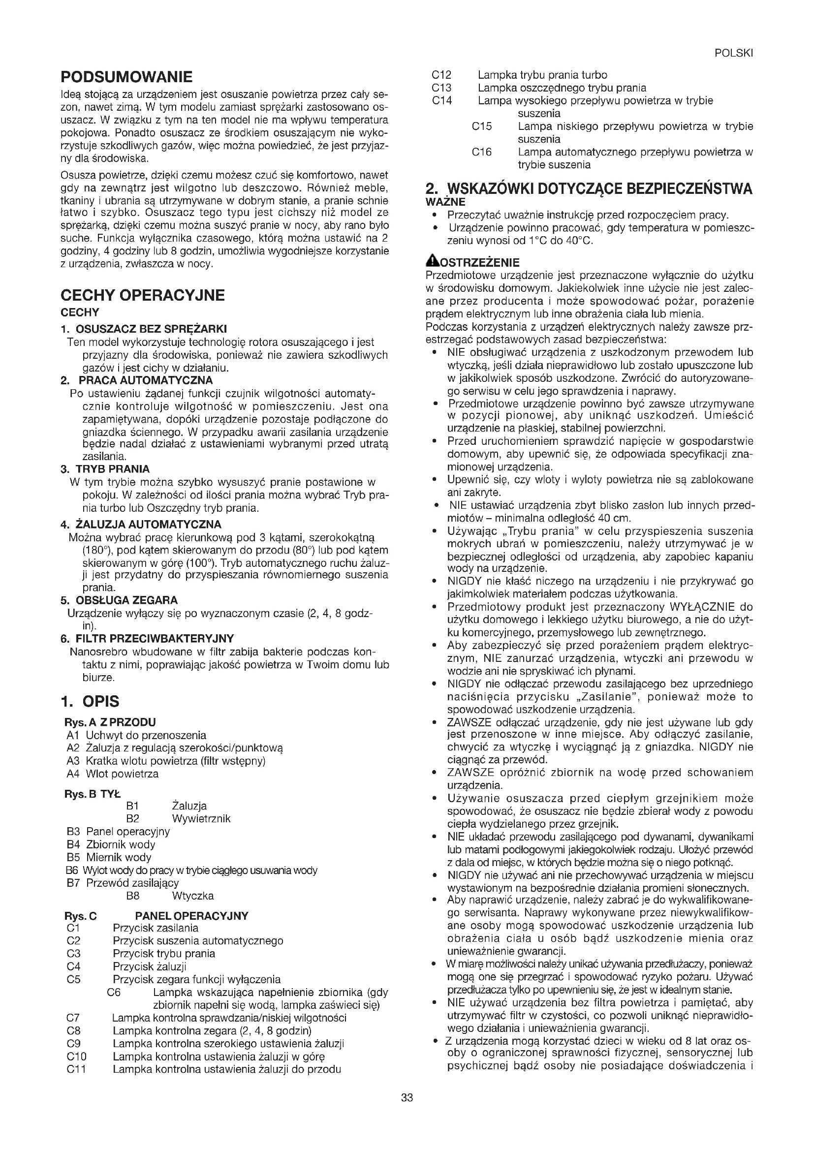 Rys. A Z PRZODU A1 Uchwyt do przenoszenia A2 Żaluzja z regulacją szerokości/punktową A3 Kratka wlotu powietrza (filtr wstępny) A4 Wlot powietrza Rys. B TYŁ B1 Żaluzja B2 Wywietrznik B3 Panel operacyjny B4 Zbiornik wody B5 Miernik wody B6 Wylot wody do pracy w trybie ciągłego usuwania wody B7 Przewód zasilający B8 Wtyczka Rys. C PANEL OPERACYJNY C1 Przycisk zasilania C2 Przycisk suszenia automatycznego C3 Przycisk trybu prania C4 Przycisk żaluzji C5 Przycisk zegara funkcji wyłączenia
