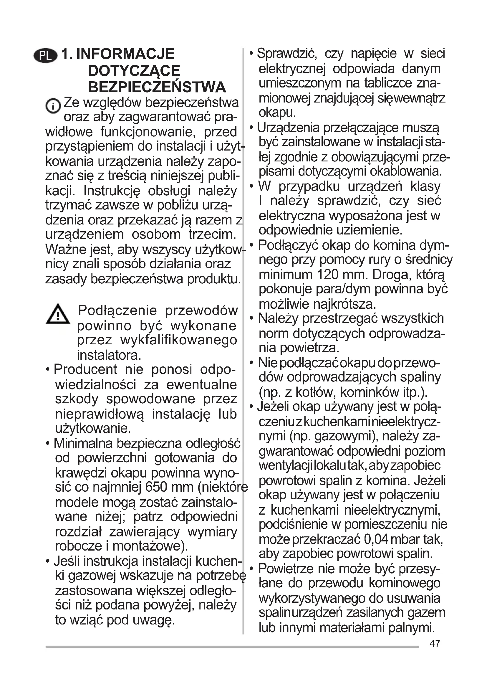 - Jeżeli okap używany jest jed- nocześnie z urządzeniami spa- lającymi gaz lub inne paliwa, w pomieszczeniu należy zapewnić odpowiednią wentylację (nie doty- czy urządzeń, które jedynie pobie- rają powietrze z pomieszczenia).49