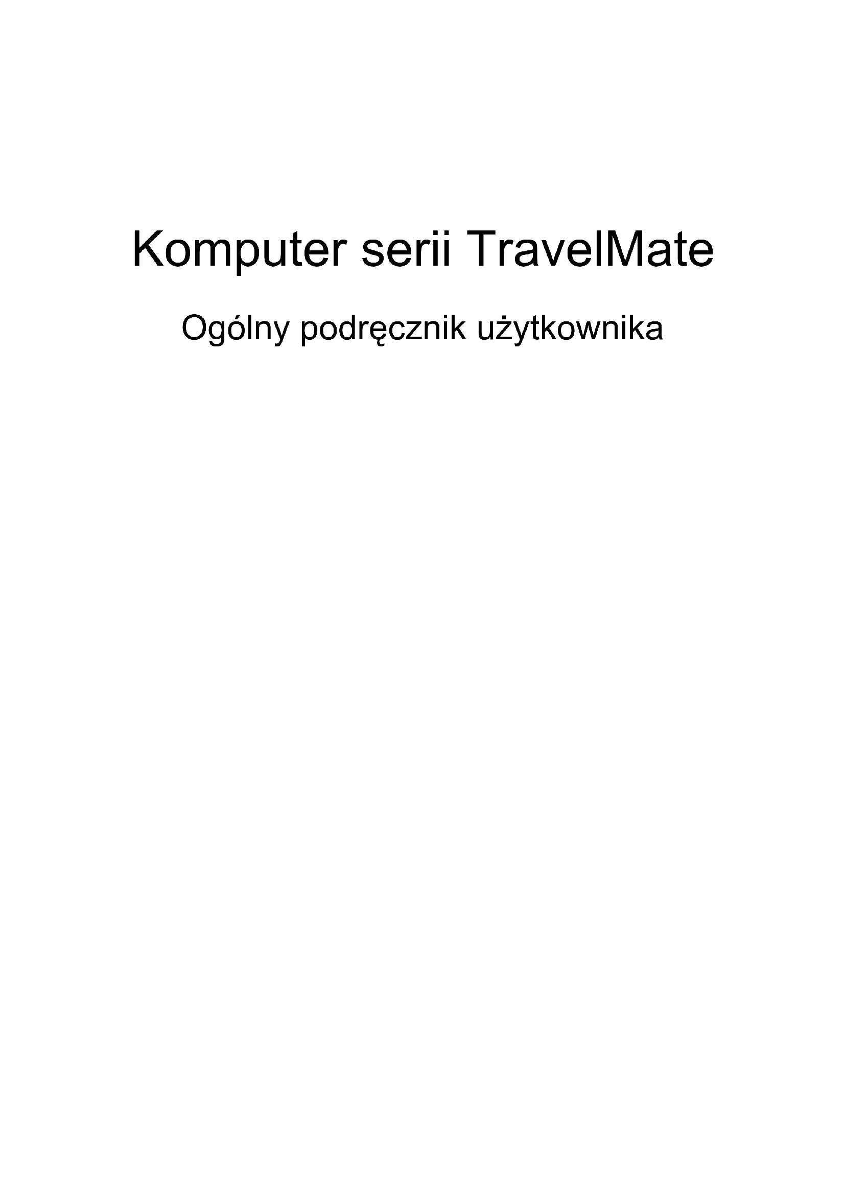 - v'n Pixel fault class Class IIKomputer serii TravelMate Ogólny podręcznik użytkownikaOznaczenie modelu: ____________________________ Numer seryjny: ________________________________ Data zakupu: __________________________________ Miejsce zakupu: ________________________________ © 2011 Wszelkie prawa zastrzeżone. Ogólny podręcznik użytkownika komputera serii TravelMate Wydanie oryginalne: 02/2011iii Informacje dotyczące bezpieczeństwa i wygody użytkownika Instrukcje bezpieczeństwa Instrukcje te należy dokładnie przeczytać. Zachowaj ten dokument do wykorzystania w przyszłości. Stosować się do wszystkich ostrzeżeń i instrukcji umieszczonych na urządzeniu. Wyłączanie urządzenia przed przystąpieniem do czyszczenia Przed przystąpieniem do czyszczenia należy odłączyć urządzenie od ściennego gniazda zasilania. Nie stosować środków czyszczących w płynie i w aerozolu. Do czyszczenia używać wilgotnej szmatki. OSTRZEŻENIE dotyczące odłączania urządzenia Należy stosować się do następujących wytycznych podczas przyłączania i odłączania zasilania do zespołu zasilacza: Zainstalować zespół zasilacza przed przyłączeniem przewodu zasilającego do gniazdka elektrycznego prądu przemiennego. Odpiąć przewód zasilający przed wyjęciem zespołu zasilacza z komputera. Gdy system posiada kilka źródeł zasilania, należy odłączyć zasilanie od systemu odpinając wszystkie przewody zasilające od zasilaczy. OSTRZEŻENIE dotyczące dostępności Należy zadbać, aby gniazdko elektryczne, do którego przyłączany jest przewód zasilający było łatwo dostępne oraz znajdowało się możliwie jak najbliżej operatora sprzętu. W razie konieczności odłączenia zasilania sprzętu należy odpiąć przewód zasilający od gniazdka elektrycznego. OSTRZEŻENIE dotyczące zaślepek gniazd kart (tylko w niektórych modelach) Komputer jest dostarczany z zaślepkami, które zostały włożone w gniazda kart. Karty zaślepiające chronią niewykorzystywane gniazda przed kurze, metalowymi przedmiotami oraz innymi zanieczyszczeniami. Należy zachować te zaślepki, i korzystać z nich w chwili, gdy gniazda pozostają puste. OSTRZEŻENIA dotyczące korzystania ze słuchawek Aby chronić swój słuch przestrzegaj poniższych zaleceń.