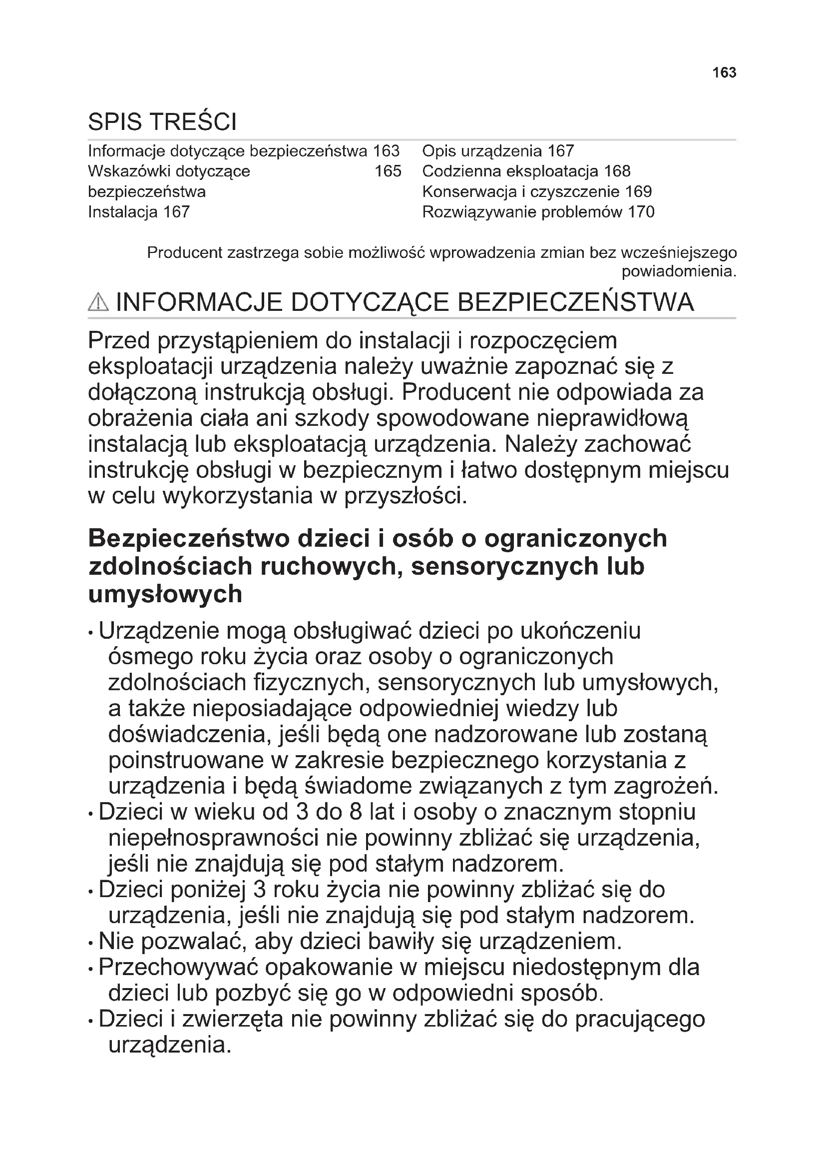 Instalacja 167 Opis urządzenia 167 Codzienna eksploatacja 168 Konserwacja i czyszczenie 169 Rozwiązywanie problemów 170 Producent zastrzega sobie możliwość wprowadzenia zmian bez wcześniejszego powiadomienia.