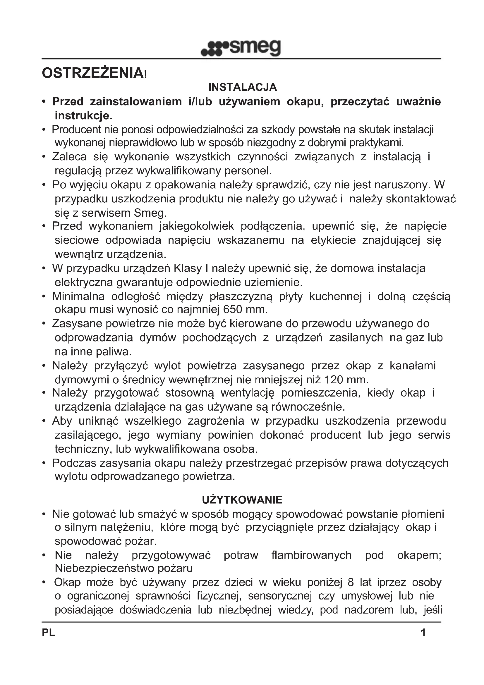 - Po wyjęciu okapu z opakowania należy sprawdzić, czy nie jest naruszony. W przypadku uszkodzenia produktu nie należy go używać i należy skontaktować się z serwisem Smeg.