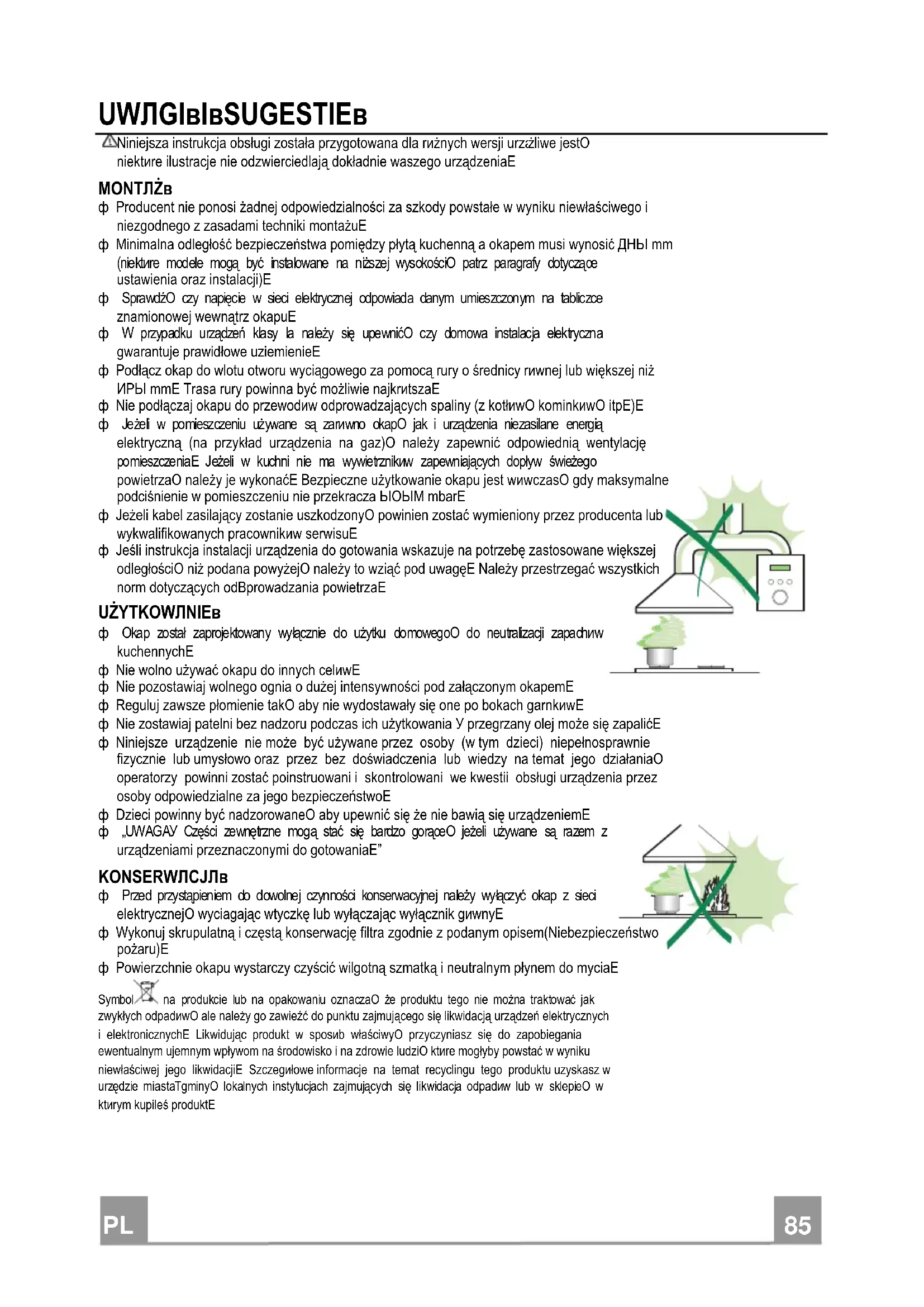 - Powierzchnie okapu wystarczy czyścić wilgotną szmatką i neutralnym płynem do mycia. Symbol na produkcie lub na opakowaniu oznacza, że produktu tego nie można traktować jak zwykłych odpadów, ale należy go zawieźć do punktu zajmującego się likwidacją urządzeń elektrycznych i elektronicznych. Likwidując produkt w sposób właściwy, przyczyniasz się do zapobiegania ewentualnym ujemnym wpływom na środowisko i na zdrowie ludzi, które mogłyby powstać w wyniku niewłaściwej jego likwidacji. Szczegółowe informacje na temat recyclingu tego produktu uzyskasz w urzędzie miasta/gminy, lokalnych instytucjach zajmujących się likwidacja odpadów lub w sklepie, w którym kupileś produkt.PL