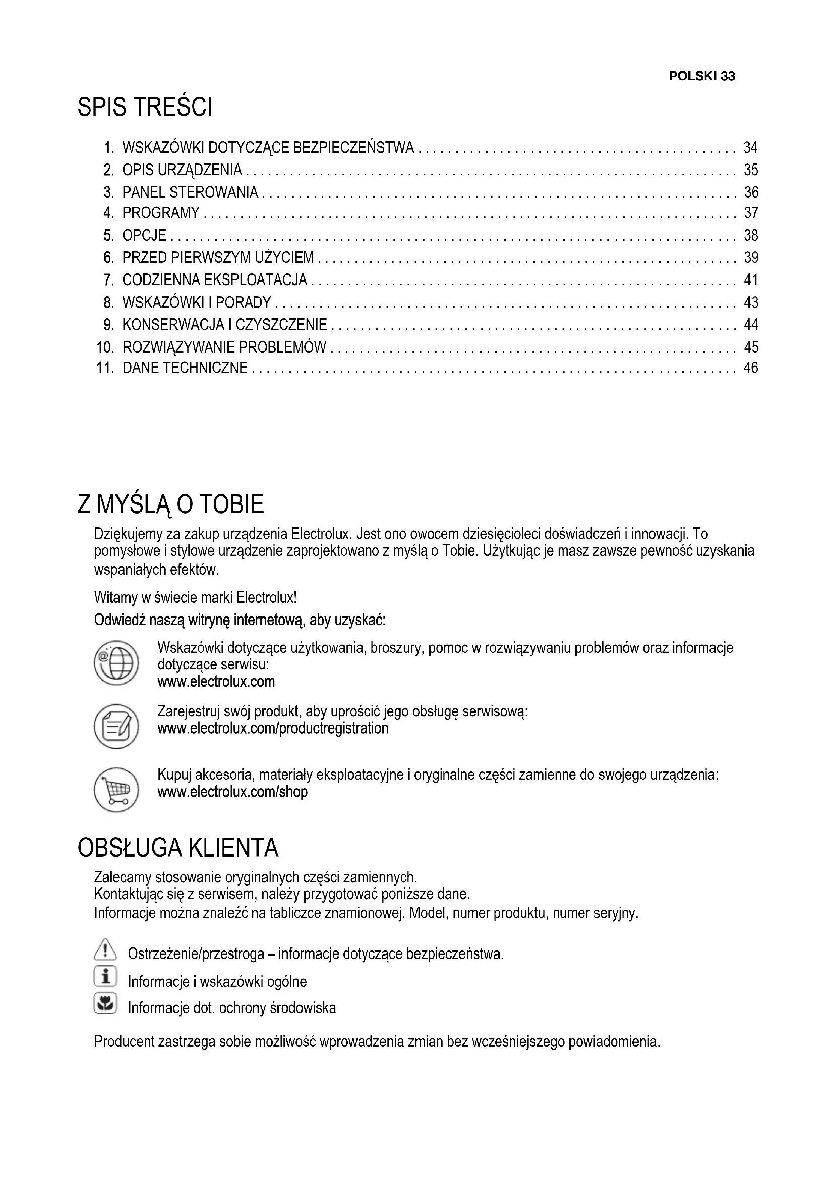 Dziękujemy za zakup urządzenia Electrolux. Jest ono owocem dziesięcioleci doświadczeń i innowacji. To pomysłowe i stylowe urządzenie zaprojektowano z myślą o Tobie. Użytkując je masz zawsze pewność uzyskania wspaniałych efektów. Witamy w świecie marki Electrolux! Odwiedź naszą witrynę internetową, aby uzyskać: Wskazówki dotyczące użytkowania, broszury, pomoc w rozwiązywaniu problemów oraz informacje dotyczące serwisu: www.electrolux.com Zarejestruj swój produkt, aby uprościć jego obsługę serwisową: www.electrolux.com/productregistration Kupuj akcesoria, materiały eksploatacyjne i oryginalne części zamienne do swojego urządzenia: www.electrolux.com/shop