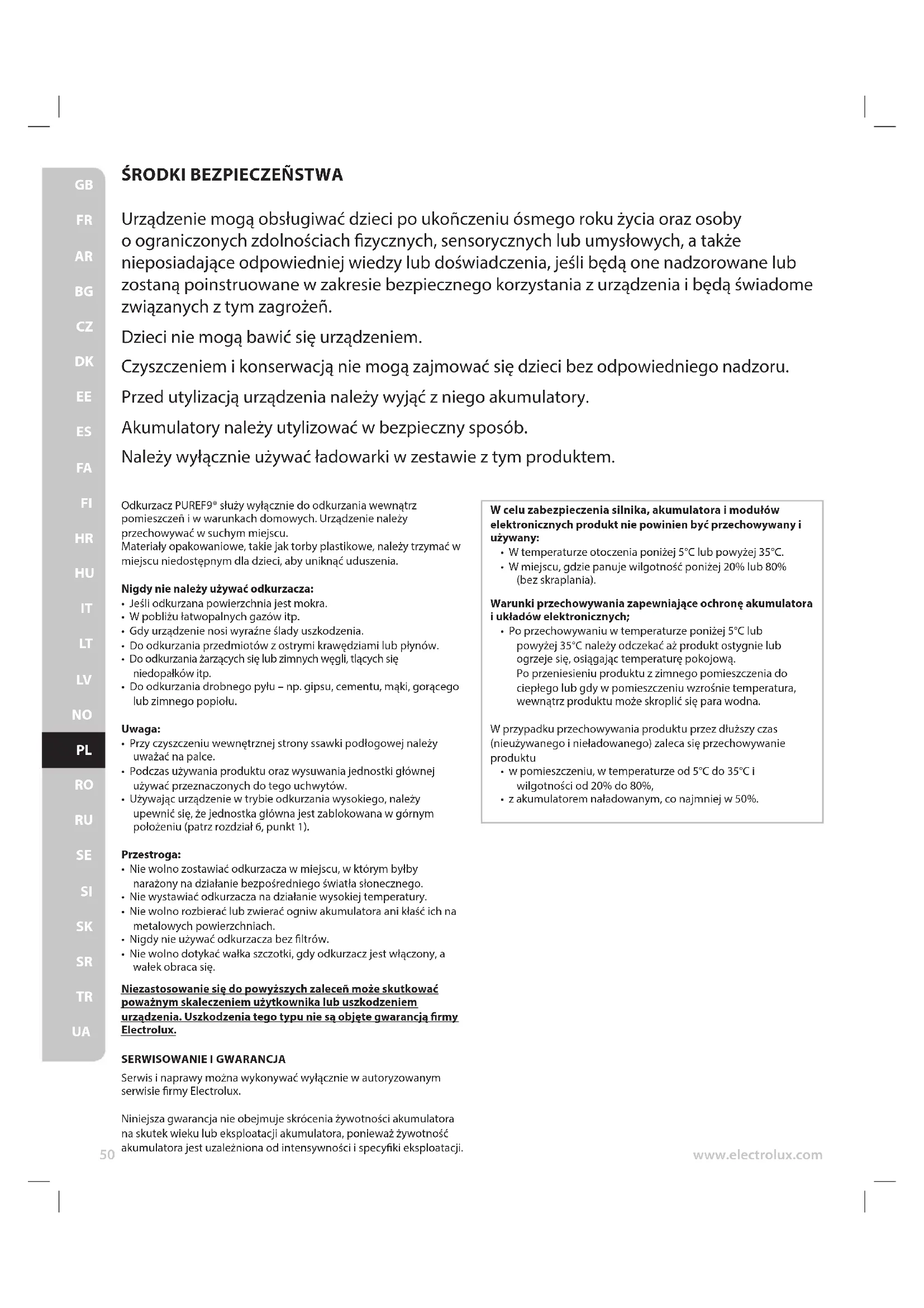 Serwis i naprawy można wykonywać wyłącznie w autoryzowanym serwisie rmy Electrolux. Niniejsza gwarancja nie obejmuje skrócenia żywotności akumulatora na skutek wieku lub eksploatacji akumulatora, ponieważ żywotność akumulatora jest uzależniona od intensywności i specyki eksploatacji.