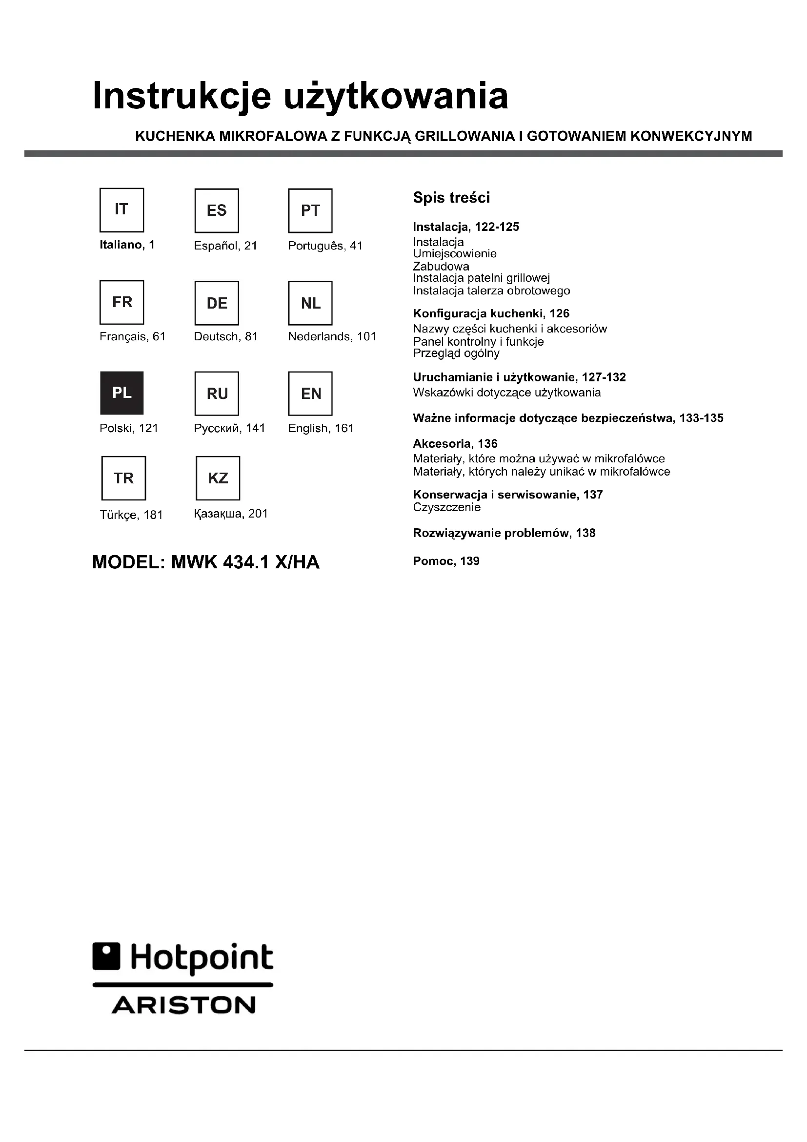 Znajdź bezpłatnie instrukcję urządzenia MWK 434.1 XHA HOTPOINT-ARISTON w formacie PDF.