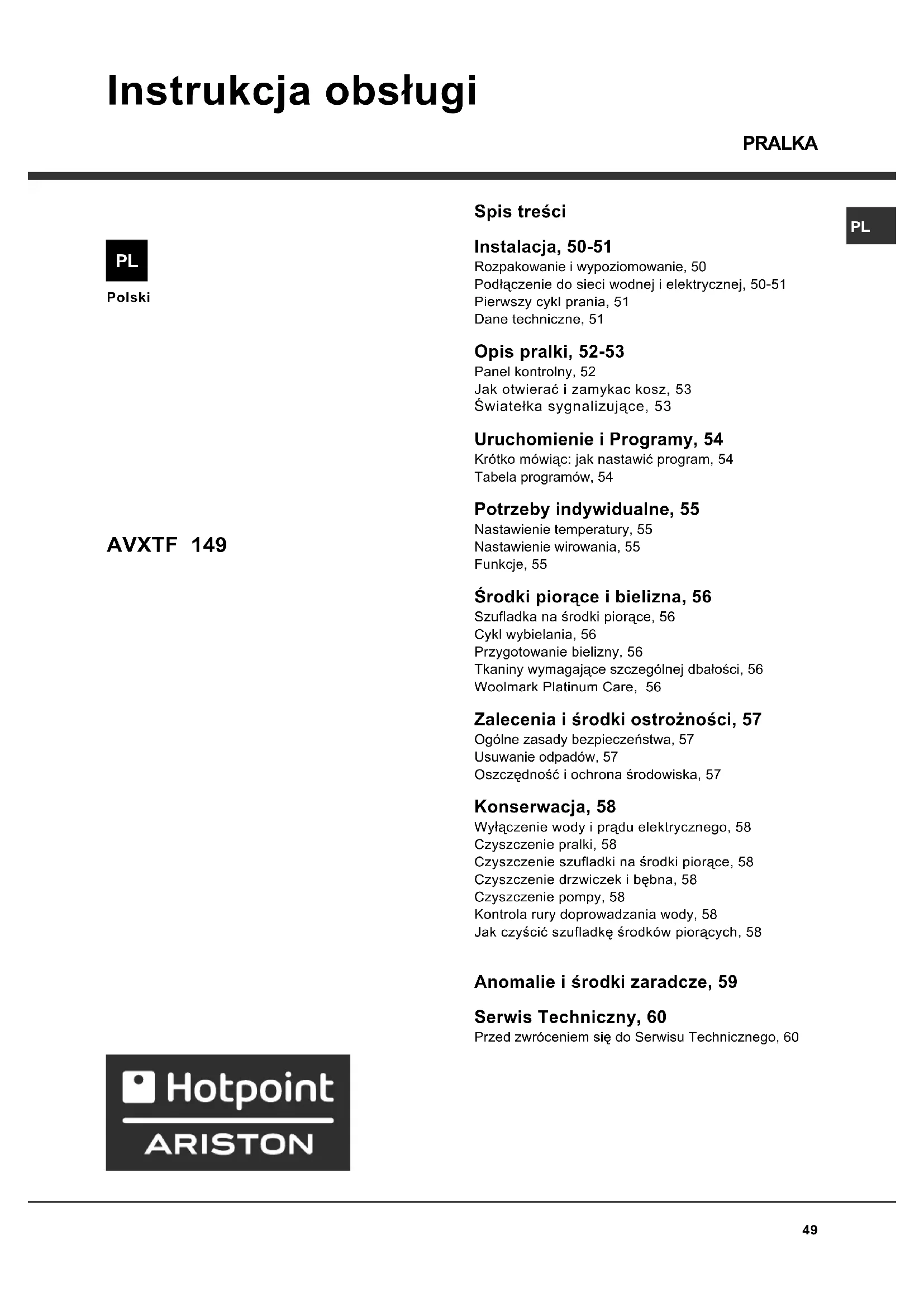 AVTXF 149 (EU) - Pralka HOTPOINT ARISTON - Bezpłatna instrukcja obsługi