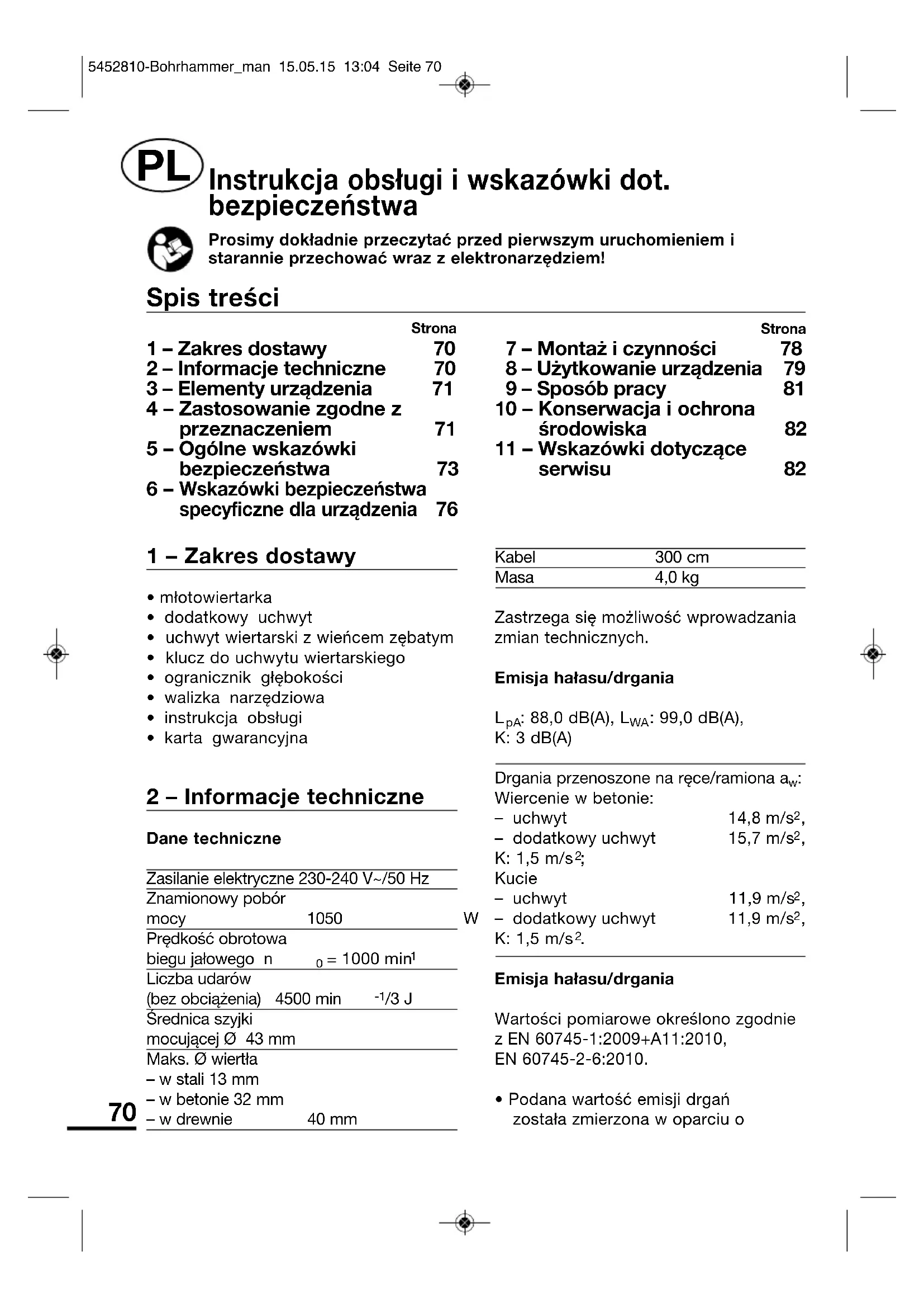 - młotowiertarka• dodatkowy uchwyt• uchwyt wiertarski z wieńcem zębatym• klucz do uchwytu wiertarskiego• ogranicznik głębokości• walizka narzędziowa• instrukcja obsługi• karta gwarancyjna 2 – Informacje techniczne Dane techniczneZasilanie elektryczne 230-240 V~/50 HzZnamionowy pobórmocy 1050 WPrędkość obrotowabiegu jałowego n = 1000 min Liczba udarów(bez obciążenia) 4500 min