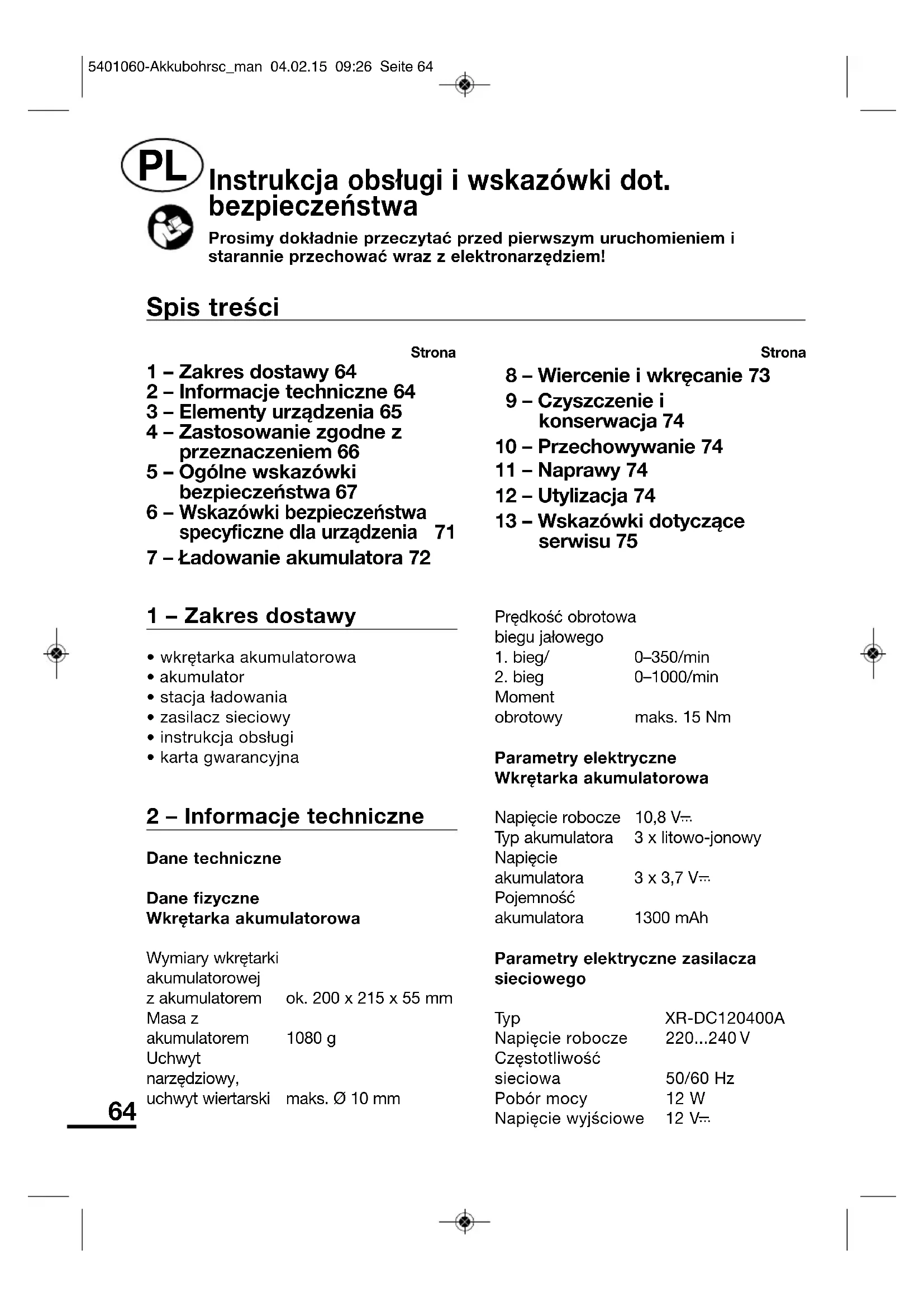 5401060-Akkubohrsc_man 04.02.15 09:26 Seite 63Instrukcja obsługi i wskazówki dot. bezpieczeństwa Prosimy dokładnie przeczytać przed pierwszym uruchomieniem istarannie przechować wraz z elektronarzędziem! Strona 1 – Zakres dostawy 64 2 – Informacje techniczne 64 3 – Elementy urządzenia 65 4 – Zastosowanie zgodne z przeznaczeniem 66 5 – Ogólne wskazówki bezpieczeństwa 67 6 – Wskazówki bezpieczeństwa specyficzne dla urządzenia