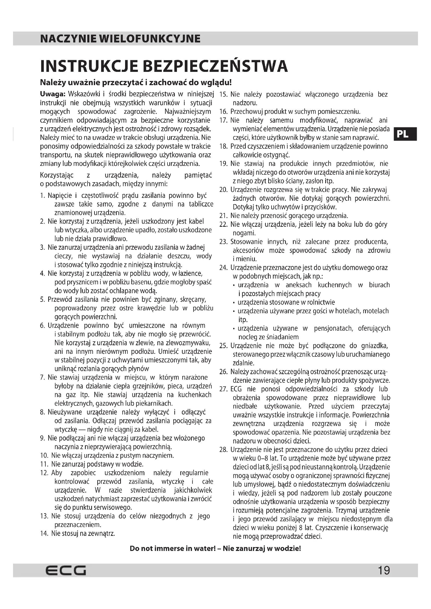 Papier służący do owinięcia itektura falista – przekazać na wysypisko śmieci. Folia opakowaniowa, torby PE, elementy zplastiku – wrzucić do pojemników zplastikiem do recyklingu. USUWANIE PRODUKTÓW PO ZAKOŃCZENIU EKSPLOATACJI Usuwanie zużytego sprzętu elektrycznego ielektronicznego (dotyczy krajów członkowskich UE iinnych krajów europejskich zwprowadzonym systemem zbiórki odpadów) Przedstawiony symbol na produkcie lub opakowaniu oznacza, że produkt nie może być zaliczany do odpadów komunalnych. Należy go przekazać do odpowiedniego punktu zajmującego się recyklingiem sprzętu elektrycznego i elektronicznego. Prawidłowy recykling produktu zabiega negatywnym konsekwencjom dla zdrowia ludzkiego iśrodowiska naturalnego. Recykling przyczynia się do zachowania surowców naturalnych. Wcelu uzyskania dalszych informacji orecyklingu tego produktu należy się skontaktować zlokalnymi władzami, krajową organizacją zajmującą się przetwarzaniem odpadów lub sklepem, który sprzedał produkt. Produkt spełnia wymagania dyrektyw UE w zakresie kompatybilności elektromagnetycznej ibezpieczeństwa urządzeń elektrycznych. Instrukcja obsługi jest dostępna na stronie internetowej www.ecg-electro.eu. Zastrzegamy sobie prawo do zmiany tekstu i parametrów technicznych. 08/05HU