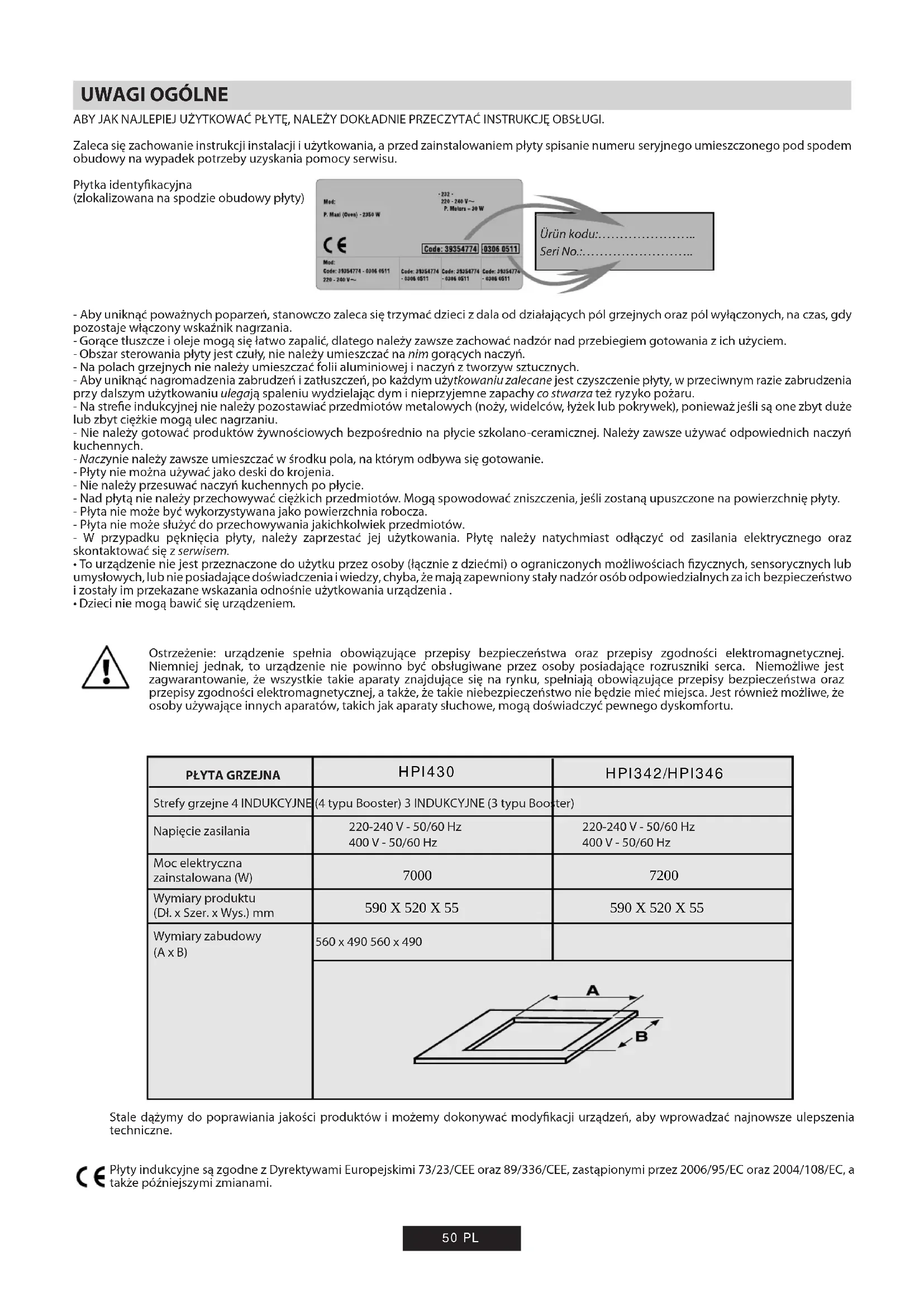 Strefy grzejne 4 INDUKCYJNE (4 typu Booster) 3 INDUKCYJNE (3 typu Booster) Napięcie zasilania 220-240 V - 50/60 Hz 400 V - 50/60 Hz 220-240 V - 50/60 Hz 400 V - 50/60 Hz Moc elektryczna zainstalowana (W) Wymiary produktu (Dł. x Szer. x Wys.) mm Wymiary zabudowy (A x B) 560 x 490 560 x 490 Stale dążymy do poprawiania jakości produktów i możemy dokonywać modykacji urządzeń, aby wprowadzać najnowsze ulepszenia techniczne. Płyty indukcyjne są zgodne z Dyrektywami Europejskimi 73/23/CEE oraz 89/336/CEE, zastąpionymi przez 2006/95/EC oraz 2004/108/EC, a także późniejszymi zmianami. Ostrzeżenie: urządzenie spełnia obowiązujące przepisy bezpieczeństwa oraz przepisy zgodności elektromagnetycznej. Niemniej jednak, to urządzenie nie powinno być obsługiwane przez osoby posiadające rozruszniki serca. Niemożliwe jest zagwarantowanie, że wszystkie takie aparaty znajdujące się na rynku, spełniają obowiązujące przepisy bezpieczeństwa oraz przepisy zgodności elektromagnetycznej, a także, że takie niebezpieczeństwo nie będzie mieć miejsca. Jest również możliwe, że osoby używające innych aparatów, takich jak aparaty słuchowe, mogą doświadczyć pewnego dyskomfortu. 590 X 520 X 55