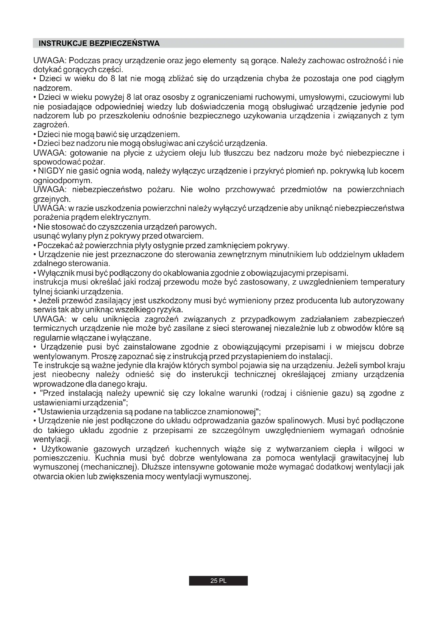 - Dzieci bez nadzoru nie mogą obsługiwac ani czyścić urządzenia. UWAGA: gotowanie na płycie z użyciem oleju lub tłuszczu bez nadzoru może być niebezpieczne i spowodować pożar.