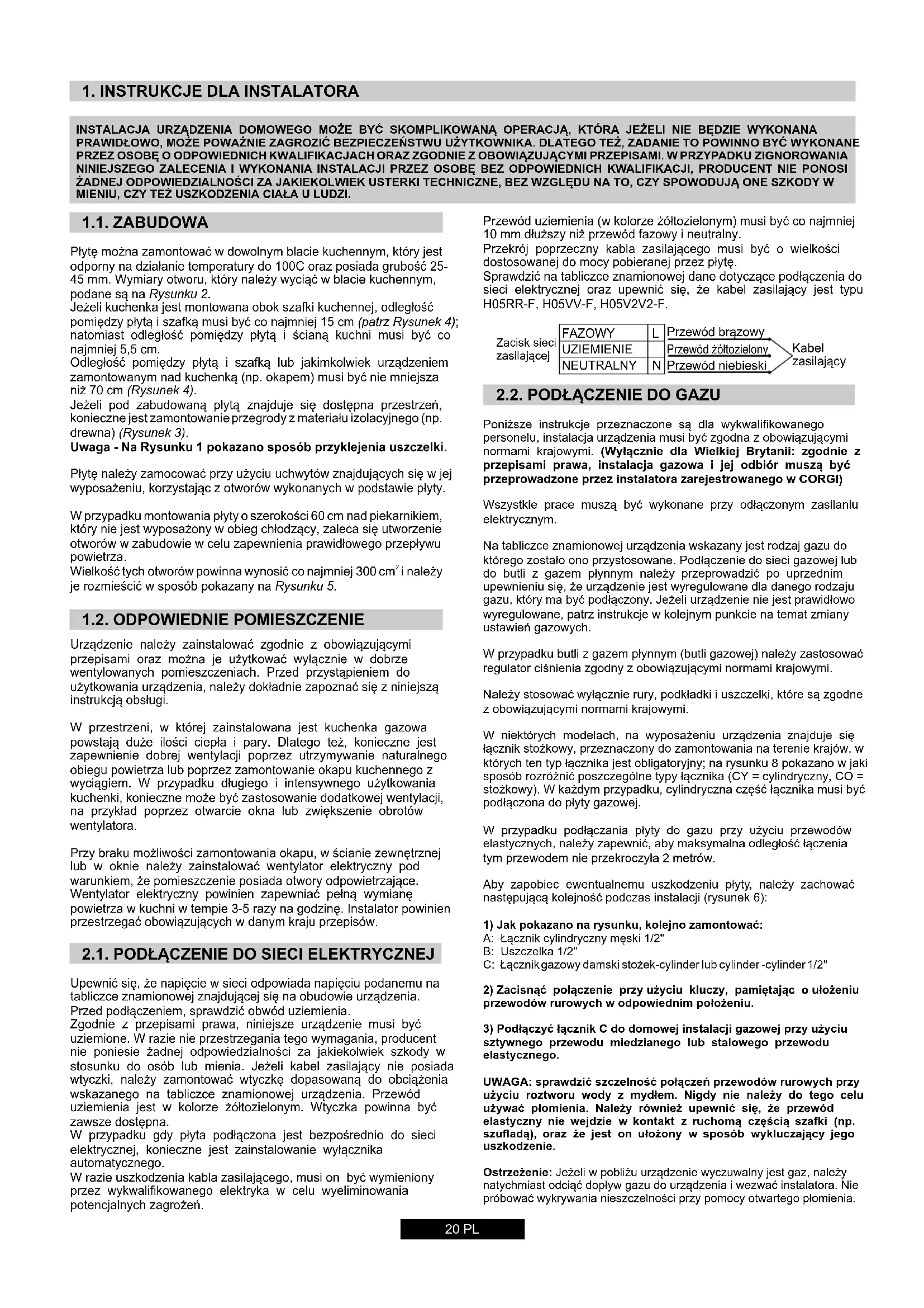 sztywnego przewodu miedzianego lub stalowego przewodu elastycznego. UWAGA: sprawdzić szczelność połączeń przewodów rurowych przy użyciu roztworu wody z mydłem. Nigdy nie należy do tego celu używać płomienia. Należy również upewnić się, że przewód elastyczny nie wejdzie w kontakt z ruchomą częścią szafki (np. szufladą), oraz że jest on ułożony w sposób wykluczający jego uszkodzenie. Ostrzeżenie: Jeżeli w pobliżu urządzenie wyczuwalny jest gaz, należy natychmiast odciąć dopływ gazu do urządzenia i wezwać instalatora. Nie próbować wykrywania nieszczelności przy pomocy otwartego płomienia. Przewód uziemienia (w kolorze żółtozielonym) musi być co najmniej 10 mm dłuższy niż przewód fazowy i neutralny. Przekrój poprzeczny kabla zasilającego musi być o wielkości dostosowanej do mocy pobieranej przez płytę. Sprawdzić na tabliczce znamionowej dane dotyczące podłączenia do sieci elektrycznej oraz upewnić się, że kabel zasilający jest typu H05RR-F, H05VV-F, H05V2V2-F.21 PL