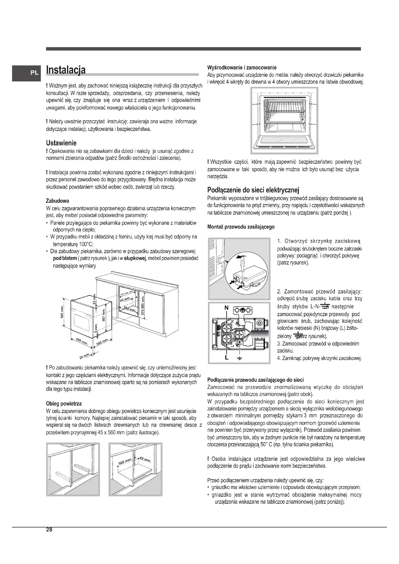 - Dla zabudowy piekarnika, zarówno w przypadku zabudowy szeregowej pod blatem ( patrz rysunek ), jak i w słupkowej, mebel powinien posiadać następujące wymiary 595 mm.595 mm.25 mm.545 mm.5 mm.567 mm.23 mm.575-585 mm.45 mm.560 mm. 547 mm. min. ! Po zabudowaniu piekarnika należy upewnić się, czy uniemożliwiony jest kontakt z jego częściami elektrycznymi. Informacje dotyczące zużycia prądu wskazane na tabliczce znamionowej oparte są na pomiarach wykonanych dla tego typu instalacji. Obieg powietrza W celu zapewnienia dobrego obiegu powietrza koniecznym jest usunięcie tylnej ścianki komory. Najlepiej zainstalować piekarnik w taki sposób, aby wspierał się na dwóch listwach drewnianych lub na drewnianej desce z prześwitem przynajmniej 45 x 560 mm (patrz ilustracje). 560 mm. 45 mm. Wyśrodkowanie i zamocowanie Aby przymocować urządzenie do mebla: należy otworzyć drzwiczki piekarnika i wkręcić 4 wkręty do drewna w 4 otwory umieszczone na listwie obwodowej. ! Wszystkie części, które mają zapewnić bezpieczeństwo powinny być zamocowane w taki sposób, aby nie można ich było usunąć bez użycia narzędzia. Podłączenie do sieci elektrycznej Piekarniki wyposażone w trójbiegunowy przewód zasilający dostosowane są do funkcjonowania na prąd zmienny, przy napięciu i częstotliwości wskazanych na tabliczce znamionowej umieszczonej na urządzeniu (patrz poniżej ). Montaż przewodu zasilającego