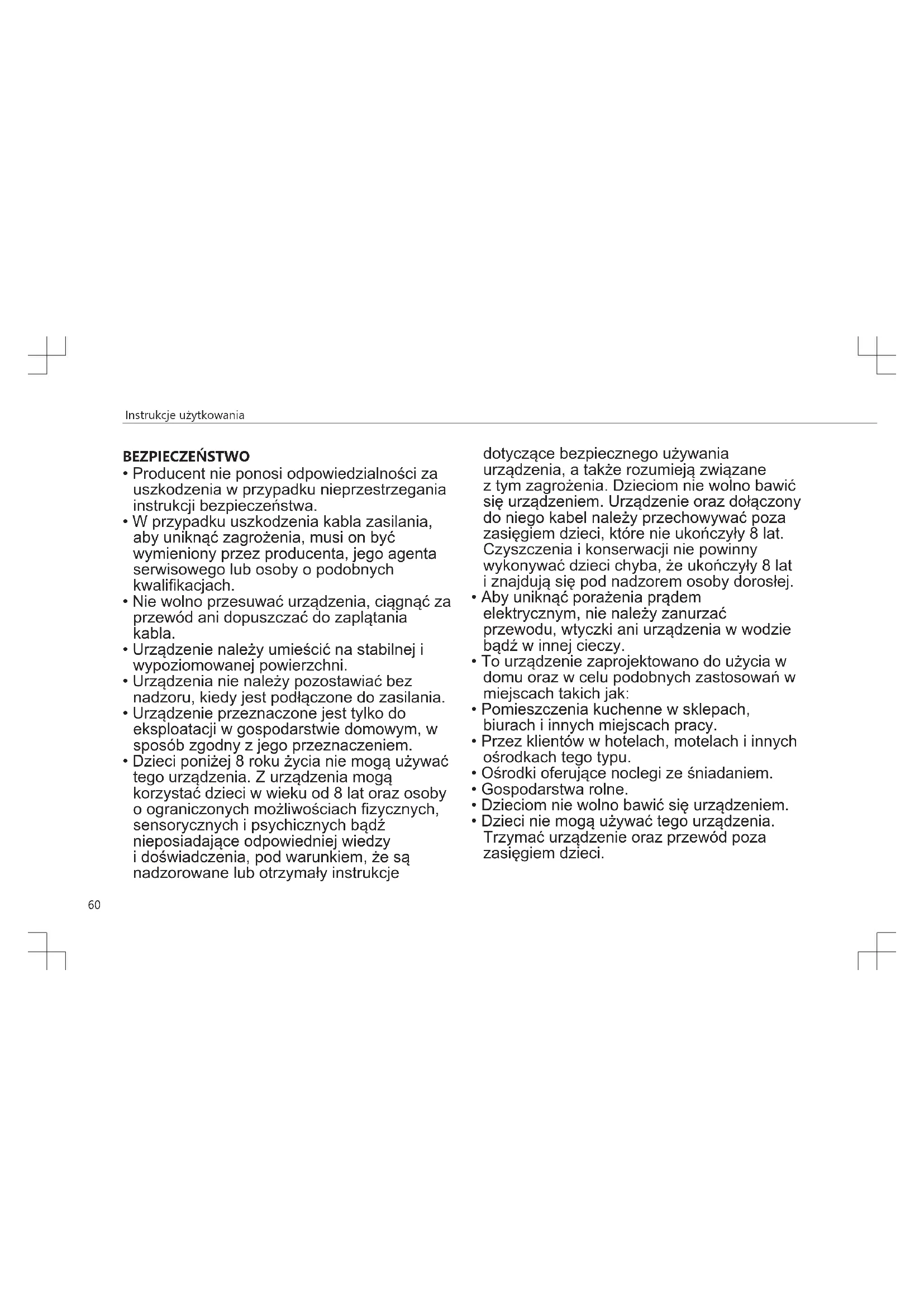 - Dzieci nie mogą używać tego urządzenia. Trzymać urządzenie oraz przewód poza zasięgiem dzieci.Instrukcje użytkowania