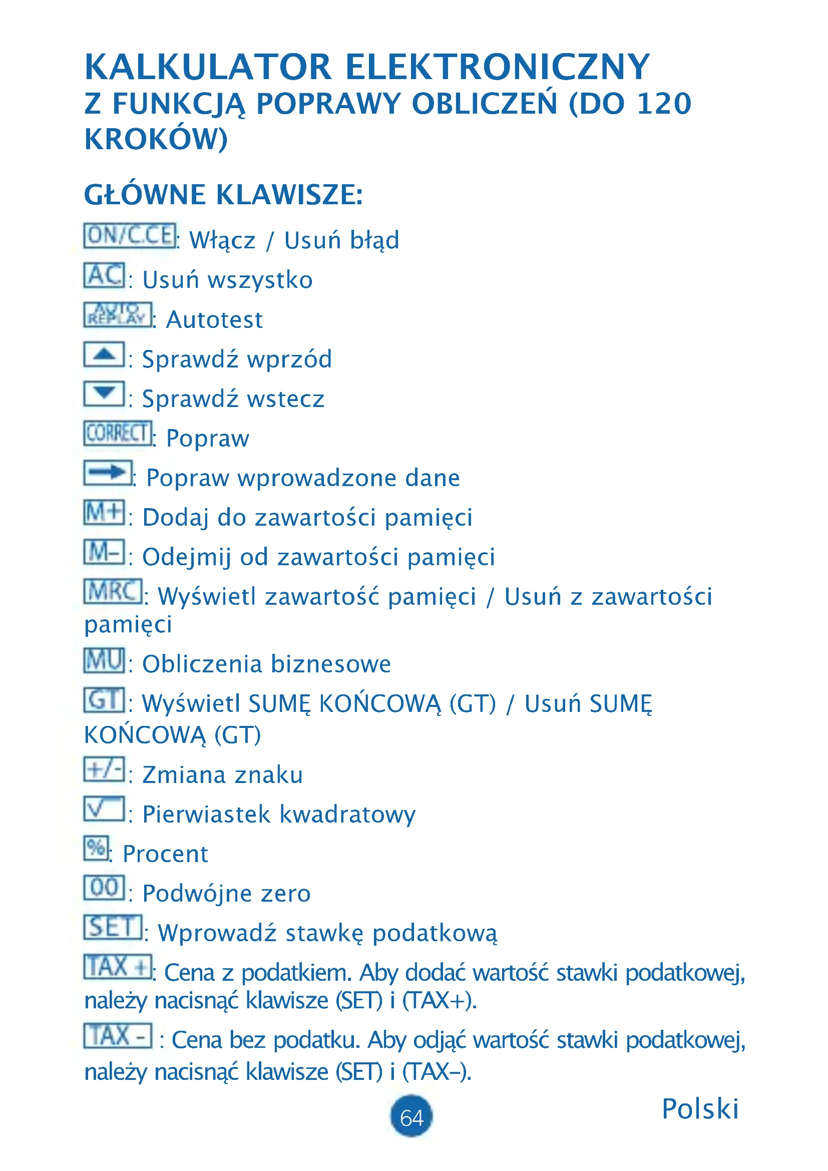 KROKÓW) GŁÓWNE KLAWISZE: : Włącz / Usuń błąd : Usuń wszystko : Autotest : Sprawdź wprzód : Sprawdź wstecz : Popraw : Popraw wprowadzone dane : Dodaj do zawartości pamięci : Odejmij od zawartości pamięci : Wyświetl zawartość pamięci / Usuń z zawartości pamięci : Obliczenia biznesowe : Wyświetl SUMĘ KOŃCOWĄ (GT) / Usuń SUMĘ KOŃCOWĄ (GT) : Zmiana znaku : Pierwiastek kwadratowy : Procent : Podwójne zero : Wprowadź stawkę podatkową : Cena z podatkiem. Aby dodać wartość stawki podatkowej, należy nacisnąć klawisze (SET) i (TAX+). : Cena bez podatku. Aby odjąć wartość stawki podatkowej, należy nacisnąć klawisze (SET) i (TAX-).65 FUNKCJE PRZEŁĄCZNIKÓW: