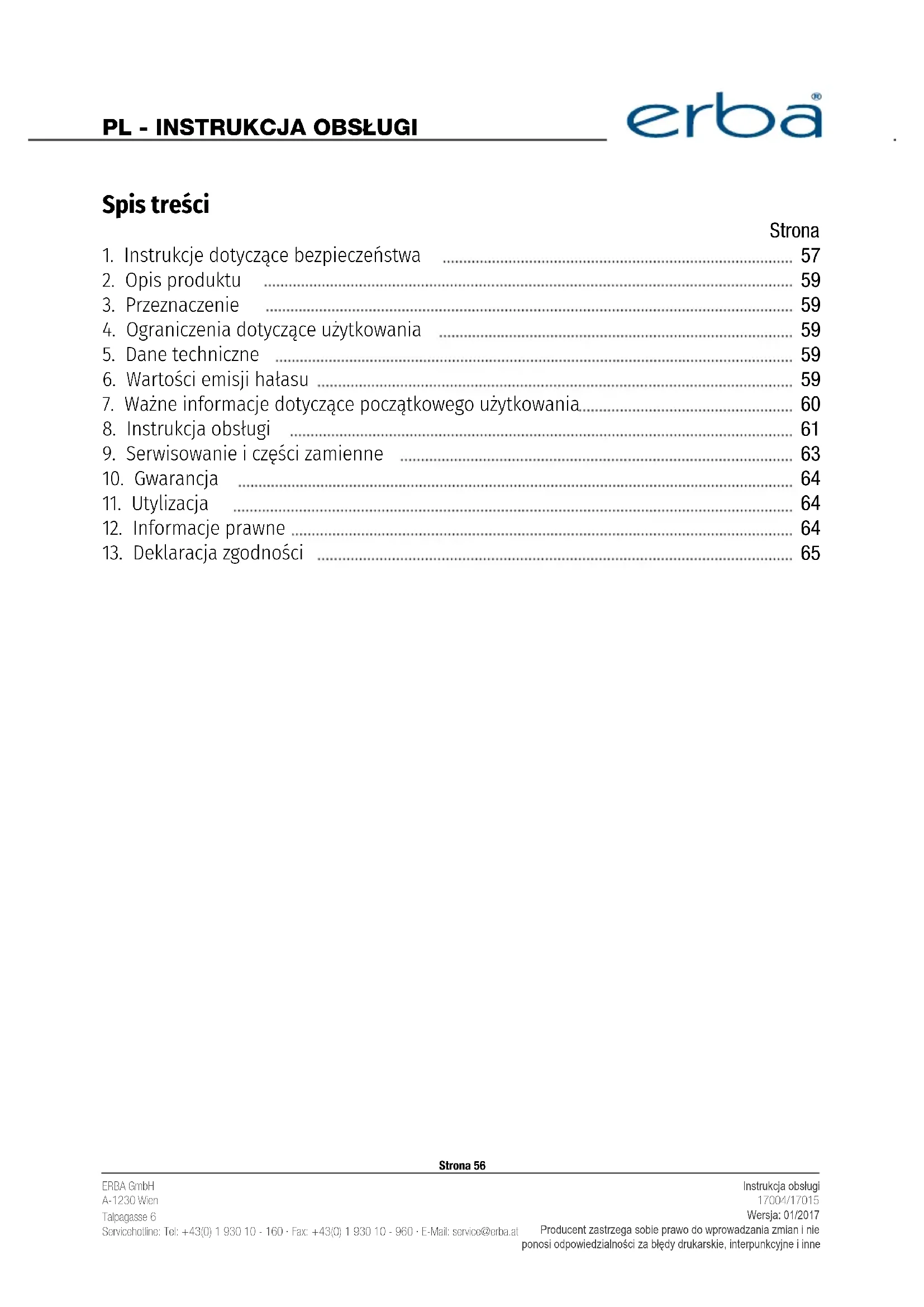 Wszelkie prawa zastrzezone. Niniejsza instrukcja jest chroniona sprawami autorskimi. Powielanie w dowolnej postaci (cyfrowe, drukowanie itp.) bez pisemnej zgody ERBA GmbH jest surowo wzbronione.