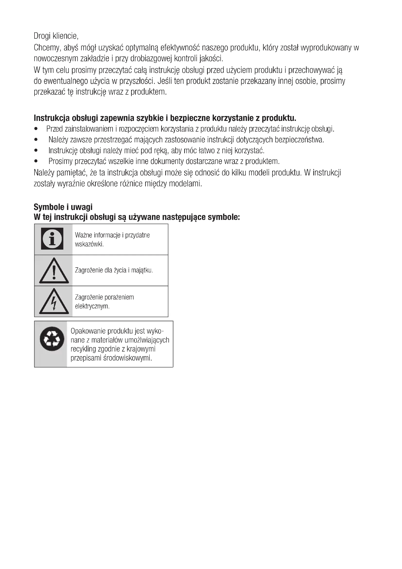 - Prosimy przeczytać wszelkie inne dokumenty dostarczane wraz z produktem. Należy pamiętać, że ta instrukcja obsługi może się odnosić do kilku modeli produktu. W instrukcji zostały wyraźnie określone różnice między modelami. Symbole i uwagi W tej instrukcji obsługi są używane następujące symbole: