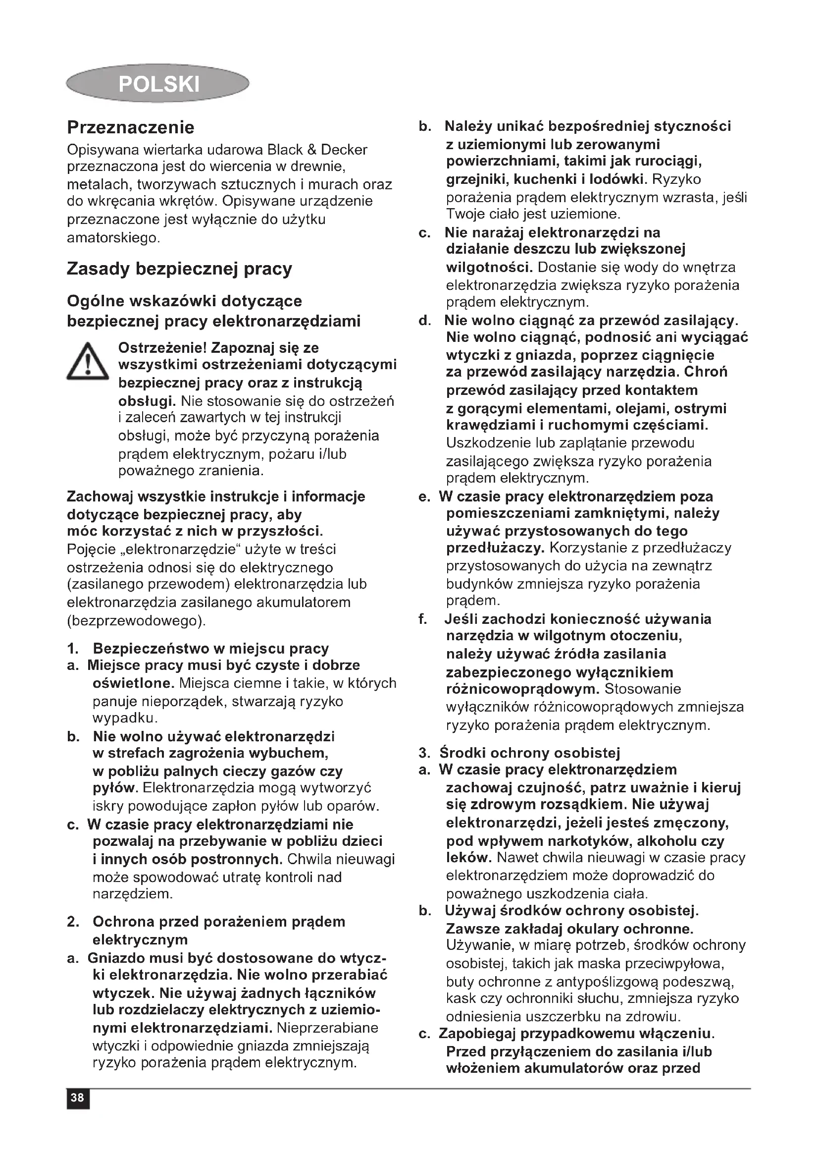 évi IV. törvény 306-310. §-aiban, valamint a 49/2003. (VII. 30.) GKM rendeletben meghatározott jogok illetik meg. Gyártó: Importőr: Stanley Black & Decker Stanley Black & Decker Deutschland GmbH Hungary Kft.,1016 Budapest D – 65510 Idstein/Ts Mészáros u. 58/b Black & Decker str. 40.38 Przeznaczenie Opisywana wiertarka udarowa Black & Decker przeznaczona jest do wiercenia w drewnie, metalach, tworzywach sztucznych i murach oraz do wkręcania wkrętów. Opisywane urządzenie przeznaczone jest wyłącznie do użytku amatorskiego. Zasady bezpiecznej pracy Ogólne wskazówki dotyczące bezpiecznej pracy elektronarzędziami Ostrzeżenie! Zapoznaj się ze wszystkimi ostrzeżeniami dotyczącymi bezpiecznej pracy oraz z instrukcją obsługi. Nie stosowanie się do ostrzeżeń i zaleceń zawartych w tej instrukcji obsługi, może być przyczyną porażenia prądem elektrycznym, pożaru i/lub poważnego zranienia. Zachowaj wszystkie instrukcje i informacje dotyczące bezpiecznej pracy, aby móc korzystać z nich w przyszłości. Pojęcie „elektronarzędzie“ użyte w treści ostrzeżenia odnosi się do elektrycznego (zasilanego przewodem) elektronarzędzia lub elektronarzędzia zasilanego akumulatorem (bezprzewodowego).