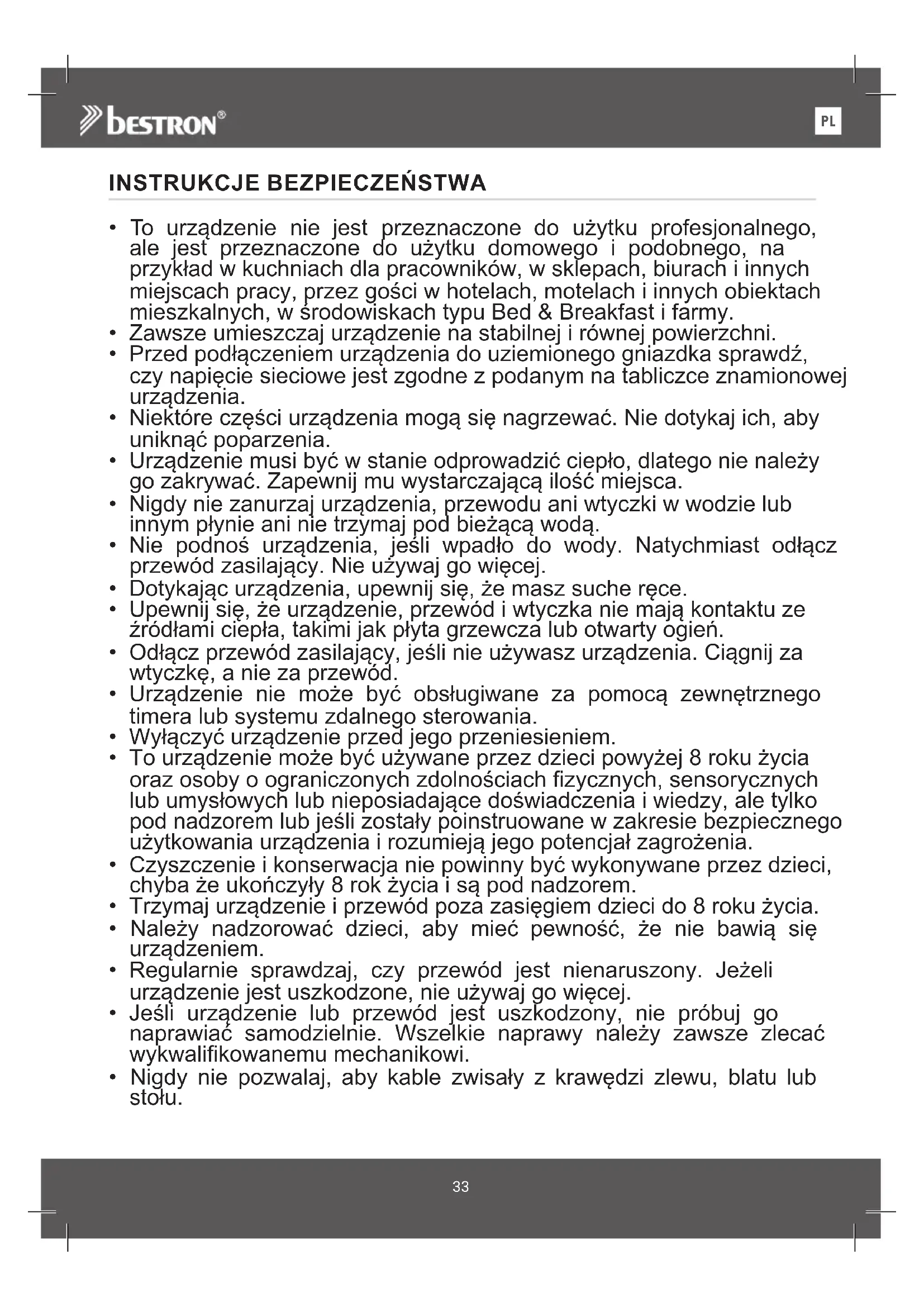 - Twoja gmina może poinformować Cię, gdzie w Twojej okolicy znaleźć wyznaczony punkt zbiórki odpadów. OBSŁUGA W mało prawdopodobnym przypadku awarii należy skontaktować się z działem serwisu Bestron: www.bestron.com/servicePL