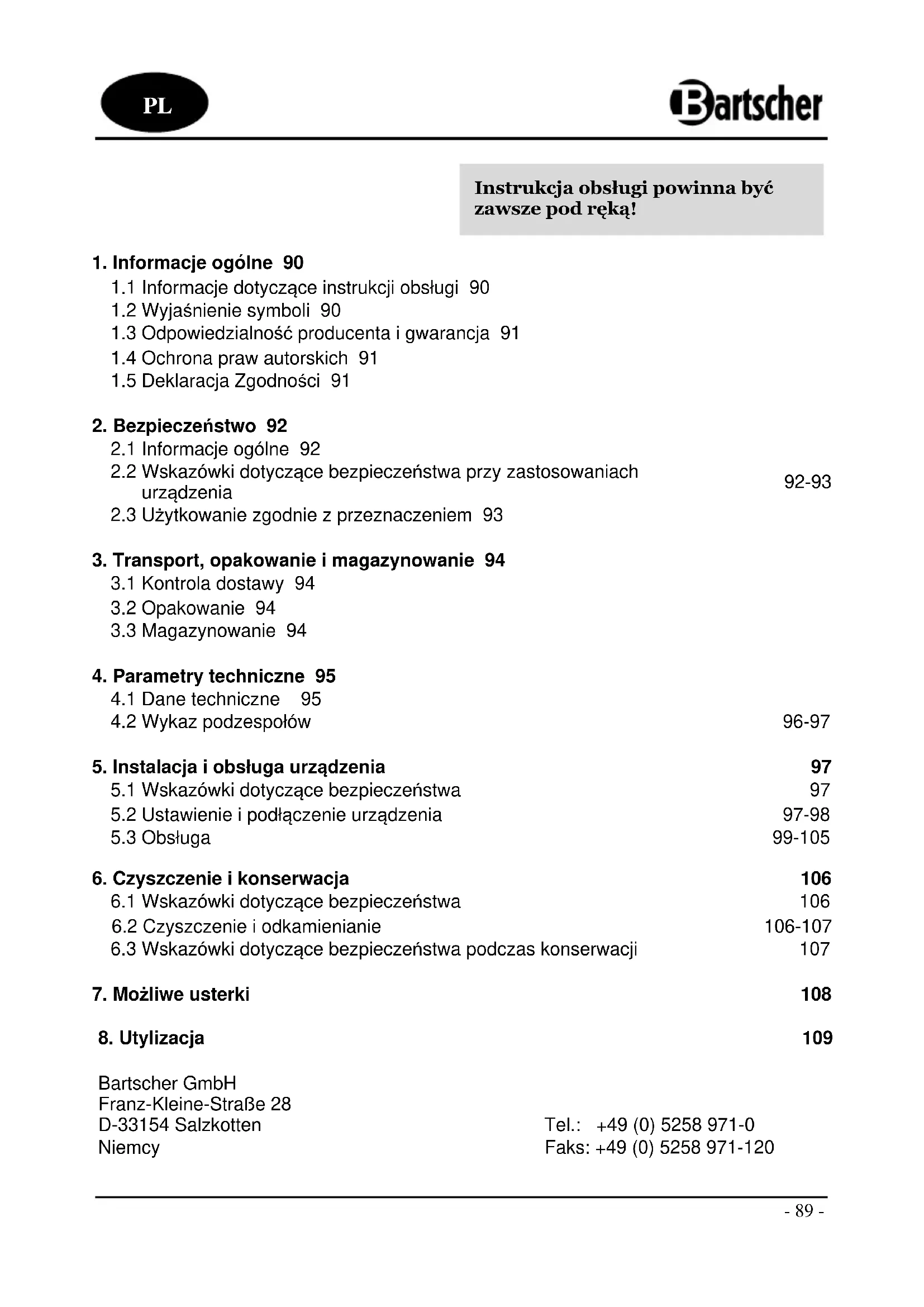 Bartscher GmbH Franz-Kleine-Straße 28 D-33154 Salzkotten Tel.: +49 (0) 5258 971-0 Niemcy Faks: +49 (0) 5258 971-120 Instrukcja obsługi powinna być zawsze pod ręką!