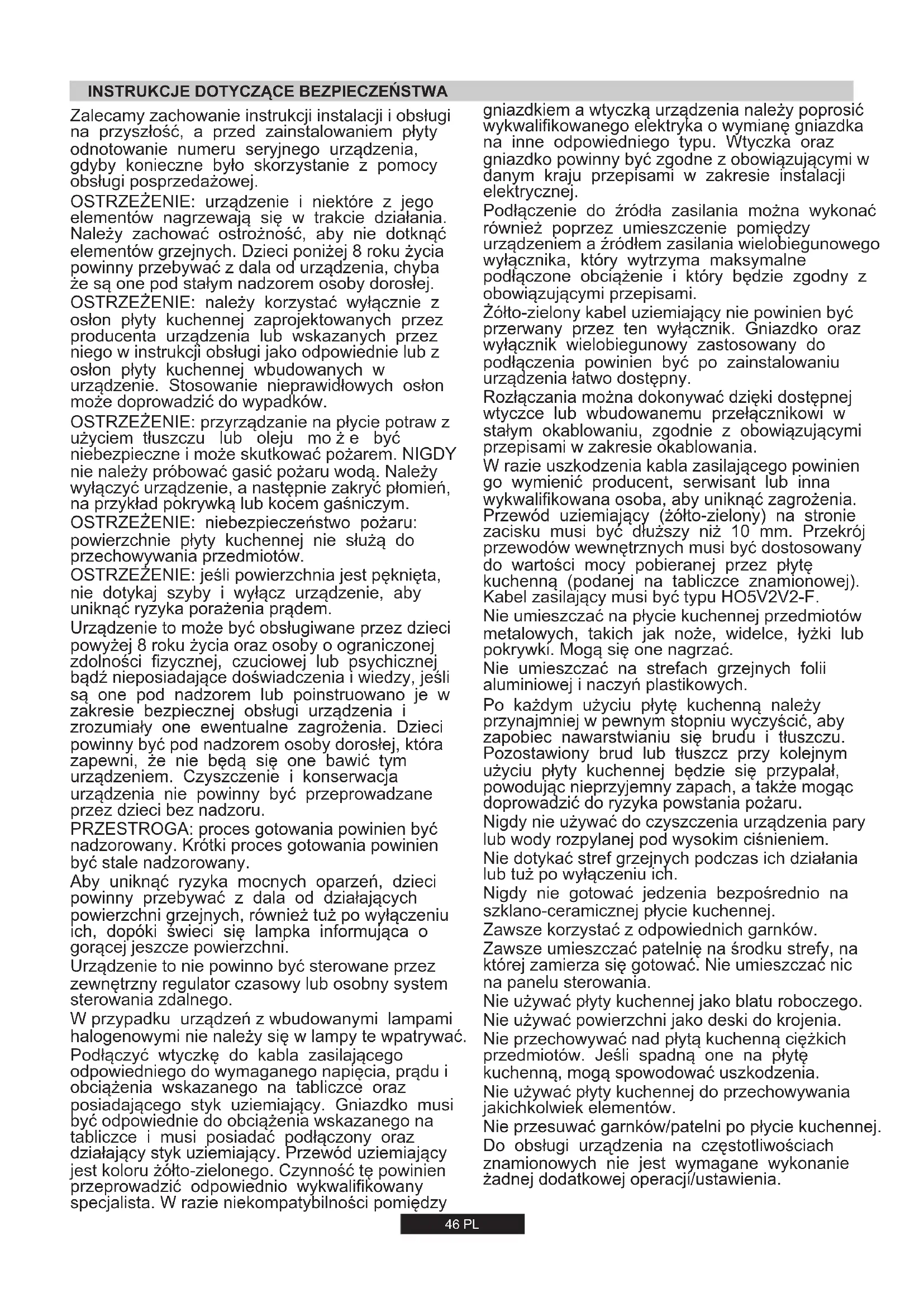 Ha megjelenik a hiba, kapcsolja ki, majd vissza a főzőlap áramellátását. Ha továbbra is fennáll a hiba, hívja az eladást követő szolgáltatást. Ha normál működés közben hirtelen jelenik meg a hiba, hívja az eladást követő szolgáltatást. Érintővezérlés szoftverhibája. Várjon, amíg lehűl. A főzőlap működése automatikusan helyreáll, ha a hőmérséklet eléri a normál értéket. Az érintővezérlés területe túl meleg, és kikapcsolta az összes főzőzónát. Várjon, amíg lehűl. Ha a hőmérséklet eléri a környezeti értéket, de a hibaüzenet továbbra is fennáll, hívja az eladást követő szolgáltatást. Várjon, amíg lehűl. Ha a hőmérséklet eléri a környezeti értéket, de a hibaüzenet továbbra is fennáll, hívja az eladást követő szolgáltatást. Meghibásodhatott az érintővezérlés hőmérséklet érzékelője. Ellenőrizze, hogy a főzőlap megfelelően van-e beszerelve. Ellenőrizze, hogy a gombok megfelelően hozzáérnek az üvegfelülethez. Bármelyik gomb túlérzékeny. Ennél a hibánál az érintővezérlés önellenőrzést hajt végre. A hiba eltűnik, ha az önellenőrzés végrehajtása kész. Ha továbbra is fennáll a hiba, hívja az eladást követő szolgáltatást. Biztonsági érintővezérlés hiba Ennél a hibánál a szoftver önellenőrzést hajt végre. A hiba eltűnik, ha az önellenőrzés végrehajtása kész. Ha továbbra is fennáll a hiba, hívja az eladást követő szolgáltatást. Biztonsági érintővezérlés hiba Ennél a hibánál a szoftver önellenőrzést hajt végre. A hiba eltűnik, ha az önellenőrzés végrehajtása kész. Ha továbbra is fennáll a hiba, hívja az eladást követő szolgáltatást. Biztonsági érintővezérlés hiba Valamelyik relé meghajtó meghibásodott. Szüntesse meg a főzőlap áramellátásást, majd egy perc elteltével kapcsolja vissza. Ha továbbra is fennáll a hiba, hívja az eladást követő szolgáltatást. Relé biztonsági hiba Hiba Intézkedés Főzőlap kijelző Meghibásodhatott az érintővezérlés hőmérséklet érzékelőjeZalecamy zachowanie instrukcji instalacji i obsługi na przyszłość, a przed zainstalowaniem płyty odnotowanie numeru seryjnego urządzenia, gdyby konieczne było skorzystanie z pomocy obsługi posprzedażowej. OSTRZEŻENIE: urządzenie i niektóre z jego elementów nagrzewają się w trakcie działania. Należy zachować ostrożność, aby nie dotknąć elementów grzejnych. Dzieci poniżej 8 roku życia powinny przebywać z dala od urządzenia, chyba że są one pod stałym nadzorem osoby dorosłej. OSTRZEŻENIE: należy korzystać wyłącznie z osłon płyty kuchennej zaprojektowanych przez producenta urządzenia lub wskazanych przez niego w instrukcji obsługi jako odpowiednie lub z osłon płyty kuchennej wbudowanych w urządzenie. Stosowanie nieprawidłowych osłon może doprowadzić do wypadków. OSTRZEŻENIE: przyrządzanie na płycie potraw z użyciem tłuszczu lub oleju mo ż e być niebezpieczne i może skutkować pożarem. NIGDY nie należy próbować gasić pożaru wodą. Należy wyłączyć urządzenie, a następnie zakryć płomień, na przykład pokrywką lub kocem gaśniczym. W przypadku urządzeń z wbudowanymi lampami halogenowymi nie należy się w lampy te wpatrywać. OSTRZEŻENIE: jeśli powierzchnia jest pęknięta, nie dotykaj szyby i wyłącz urządzenie, aby uniknąć ryzyka porażenia prądem. Urządzenie to może być obsługiwane przez dzieci powyżej 8 roku życia oraz osoby o ograniczonej zdolności fizycznej, czuciowej lub psychicznej bądź nieposiadające doświadczenia i wiedzy, jeśli są one pod nadzorem lub poinstruowano je w zakresie bezpiecznej obsługi urządzenia i zrozumiały one ewentualne zagrożenia. Dzieci powinny być pod nadzorem osoby dorosłej, która zapewni, że nie będą się one bawić tym urządzeniem. Czyszczenie i konserwacja urządzenia nie powinny być przeprowadzane przez dzieci bez nadzoru. Podłączyć wtyczkę do kabla zasilającego odpowiedniego do wymaganego napięcia, prądu i obciążenia wskazanego na tabliczce oraz posiadającego styk uziemiający. Gniazdko musi być odpowiednie do obciążenia wskazanego na tabliczce i musi posiadać podłączony oraz działający styk uziemiający. Przewód uziemiający jest koloru żółto-zielonego. Czynność tę powinien przeprowadzić odpowiednio wykwalifikowany specjalista. W razie niekompatybilności pomiędzy Aby uniknąć ryzyka mocnych oparzeń, dzieci powinny przebywać z dala od działających powierzchni grzejnych, również tuż po wyłączeniu ich, dopóki świeci się lampka informująca o gorącej jeszcze powierzchni. Urządzenie to nie powinno być sterowane przez zewnętrzny regulator czasowy lub osobny system sterowania zdalnego. PRZESTROGA: proces gotowania powinien być nadzorowany. Krótki proces gotowania powinien być stale nadzorowany. OSTRZEŻENIE: niebezpieczeństwo pożaru: powierzchnie płyty kuchennej nie służą do przechowywania przedmiotów.