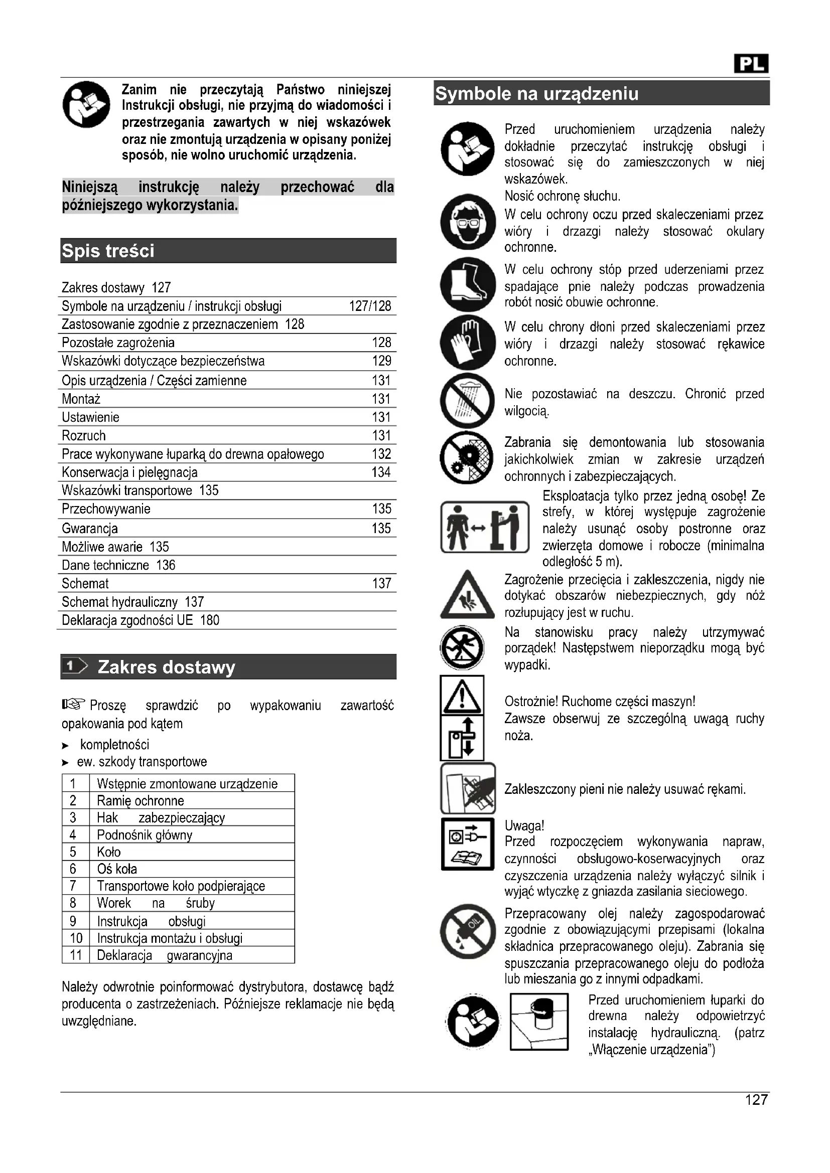 Spis treści Zakres dostawy 127 Symbole na urządzeniu / instrukcji obsługi 127/128 Zastosowanie zgodnie z przeznaczeniem 128 Pozostałe zagrożenia 128 Wskazówki dotyczące bezpieczeństwa 129 Opis urządzenia / Części zamienne 131 Montaż 131 Ustawienie 131 Rozruch 131 Prace wykonywane łuparką do drewna opałowego 132 Konserwacja i pielęgnacja 134 Wskazówki transportowe 135 Przechowywanie 135 Gwarancja 135 Możliwe awarie 135 Dane techniczne 136 Schemat 137 Schemat hydrauliczny 137 Deklaracja zgodności UE 180