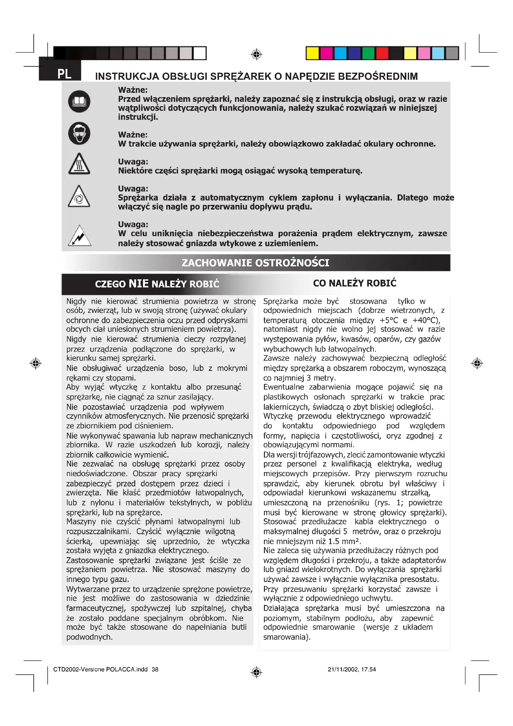 Nigdy nie kierować strumienia powietrza w stronę osób, zwierząt, lub w swoją stronę (używać okulary ochronne do zabezpieczenia oczu przed odpryskami obcych ciał uniesionych strumieniem powietrza).Nigdy nie kierować strumienia cieczy rozpylanej przez urządzenia podłączone do sprężarki, w kierunku samej sprężarki.Nie obsługiwać urządzenia boso, lub z mokrymi rękami czy stopami.Aby wyjąć wtyczkę z kontaktu albo przesunąć sprężarkę, nie ciągnąć za sznur zasilający.Nie pozostawiać urządzenia pod wpływem czynników atmosferycznych. Nie przenosić sprężarki ze zbiornikiem pod ciśnieniem.Nie wykonywać spawania lub napraw mechanicznych zbiornika. W razie uszkodzeń lub korozji, należy zbiornik całkowicie wymienić.Nie zezwalać na obsługę sprężarki przez osoby niedoświadczone. Obszar pracy sprężarki zabezpieczyć przed dostępem przez dzieci i zwierzęta. Nie kłaść przedmiotów łatwopalnych, lub z nylonu i materiałów tekstylnych, w pobliżu sprężarki, lub na sprężarce.Maszyny nie czyścić płynami łatwopalnymi lub rozpuszczalnikami. Czyścić wyłącznie wilgotną ścierką, upewniając się uprzednio, że wtyczka została wyjęta z gniazdka elektrycznego.Zastosowanie sprężarki związane jest ściśle ze sprężaniem powietrza. Nie stosować maszyny do innego typu gazu.Wytwarzane przez to urządzenie sprężone powietrze, nie jest możliwe do zastosowania w dziedzinie farmaceutycznej, spożywczej lub szpitalnej, chyba że zostało poddane specjalnym obróbkom. Nie może być także stosowane do napełniania butli podwodnych.Sprężarka może być stosowana tylko w odpowiednich miejscach (dobrze wietrzonych, z temperaturą otoczenia między +5°C e +40°C), natomiast nigdy nie wolno jej stosować w razie występowania pyłów, kwasów, oparów, czy gazów wybuchowych lub łatwopalnych.Zawsze należy zachowywać bezpieczną odległość między sprężarką a obszarem roboczym, wynoszącą co najmniej 3 metry.Ewentualne zabarwienia mogące pojawić się na plastikowych osłonach sprężarki w trakcie prac lakierniczych, świadczą o zbyt bliskiej odległości.Wtyczkę przewodu elektrycznego wprowadzić do kontaktu odpowiedniego pod względem formy, napięcia i częstotliwości, oryz zgodnej z obowiązującymi normami. Dla wersji trójfazowych, zlecić zamontowanie wtyczki przez personel z kwalikacją elektryka, według miejscowych przepisów. Przy pierwszym rozruchu sprawdzić, aby kierunek obrotu był właściwy i odpowiadał kierunkowi wskazanemu strzałką, umieszczoną na przenośniku (rys. 1; powietrze musi być kierowane w stronę głowicy sprężarki). Stosować przedłużacze kabla elektrycznego o maksymalnej długości 5 metrów, oraz o przekroju nie mniejszym niż 1.5 mm². Nie zaleca się używania przedłużaczy różnych pod względem długości i przekroju, a także adaptatorów lub gniazd wielokrotnych. Do wyłączania sprężarki używać zawsze i wyłącznie wyłącznika presostatu.Przy przesuwaniu sprężarki korzystać zawsze i wyłącznie z odpowiedniego uchwytu. Działająca sprężarka musi być umieszczona na poziomym, stabilnym podłożu, aby zapewnić odpowiednie smarowanie (wersje z układem smarowania). INSTRUKCJA OBSŁUGI SPRĘŻAREK O NAPĘDZIE BEZPOŚREDNIM