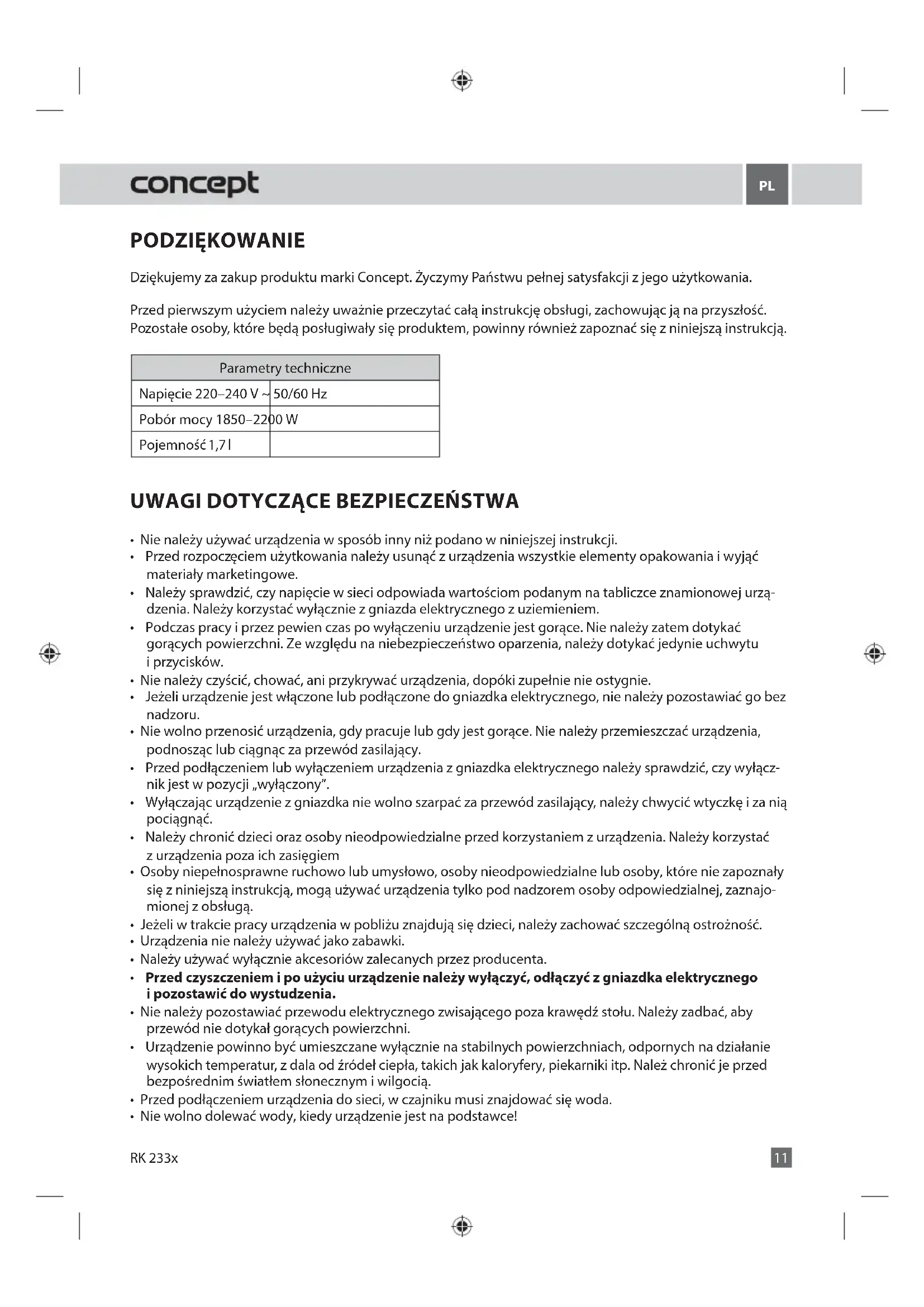 PODZIĘKOWANIE Dziękujemy za zakup produktu marki Concept. Życzymy Państwu pełnej satysfakcji z jego użytkowania. Przed pierwszym użyciem należy uważnie przeczytać całą instrukcję obsługi, zachowując ją na przyszłość. Pozostałe osoby, które będą posługiwały się produktem, powinny również zapoznać się z niniejszą instrukcją. Parametry techniczne Napięcie 220–240 V ~ 50/60 Hz Pobór mocy 1850–2200 W Pojemność 1,7 l