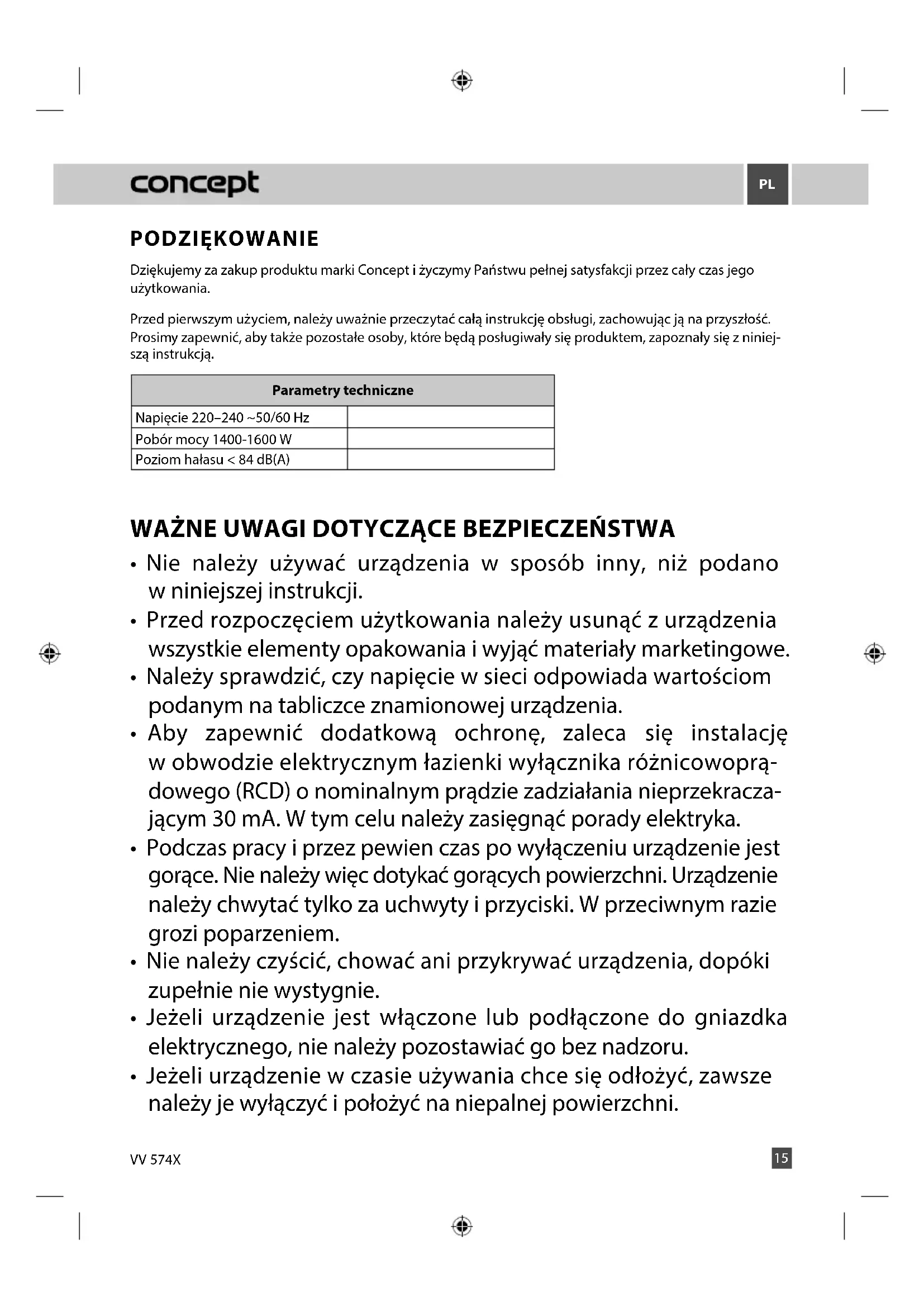 Dziękujemy za zakup produktu marki Concept i życzymy Państwu pełnej satysfakcji przez cały czas jego użytkowania. Przed pierwszym użyciem, należy uważnie przeczytać całą instrukcję obsługi, zachowując ją na przyszłość. Prosimy zapewnić, aby także pozostałe osoby, które będą posługiwały się produktem, zapoznały się z niniej- szą instrukcją. Parametry techniczne Napięcie 220–240 ~50/60 Hz Pobór mocy 1400-1600 W Poziom hałasu < 84 dB(A) WAŻNE UWAGI DOTYCZĄCE BEZPIECZEŃSTWA