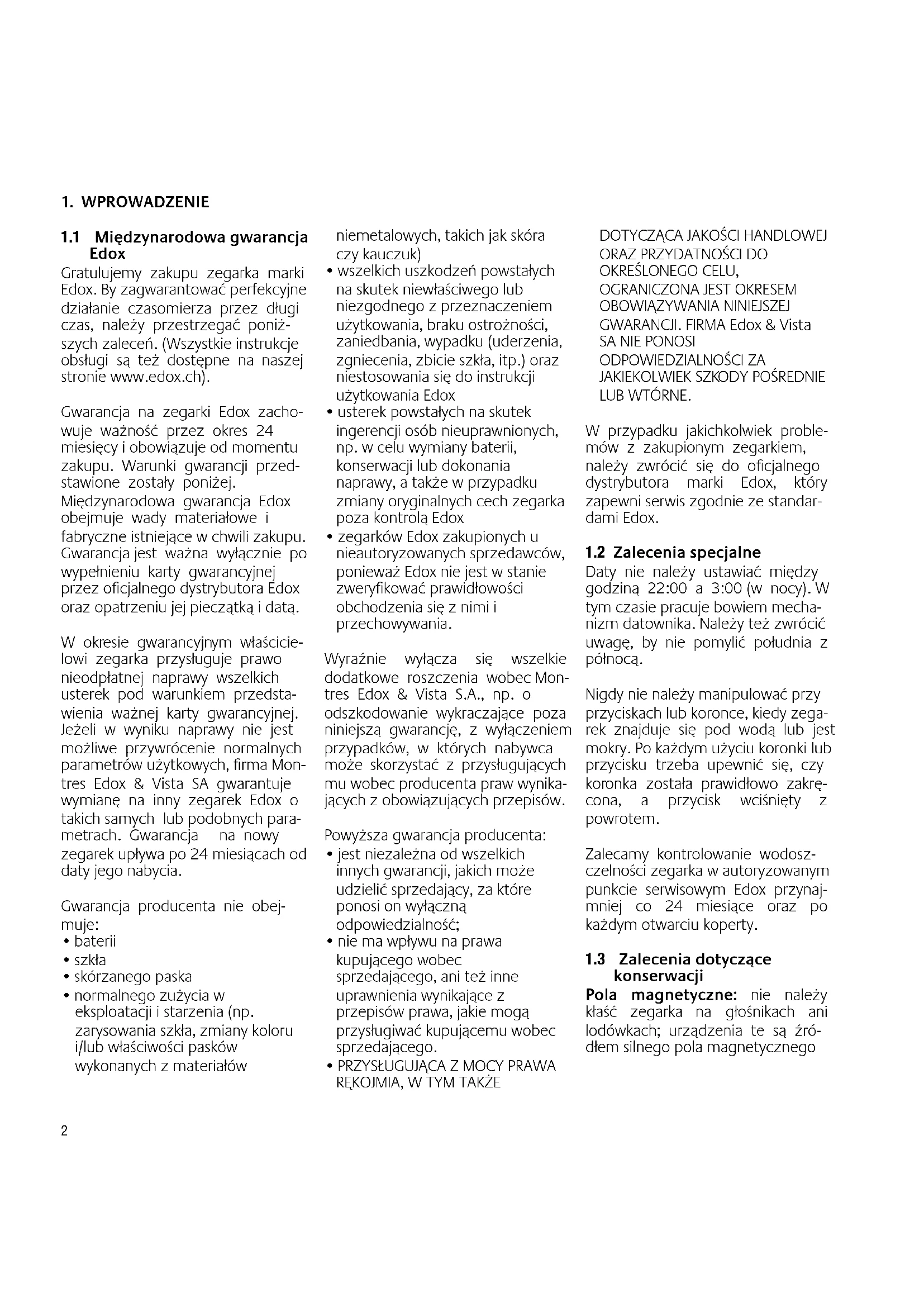 Edox Gratulujemy zakupu zegarka marki Edox. By zagwarantować perfekcyjne działanie czasomierza przez długi czas, należy przestrzegać poniż- szych zaleceń. (Wszystkie instrukcje obsługi są też dostępne na naszej stronie www.edox.ch). Gwarancja na zegarki Edox zacho- wuje ważność przez okres 24 miesięcy i obowiązuje od momentu zakupu. Warunki gwarancji przed- stawione zostały poniżej. Międzynarodowa gwarancja Edox obejmuje wady materiałowe i fabryczne istniejące w chwili zakupu. Gwarancja jest ważna wyłącznie po wypełnieniu karty gwarancyjnej przez oficjalnego dystrybutora Edox oraz opatrzeniu jej pieczątką i datą. W okresie gwarancyjnym właścicie- lowi zegarka przysługuje prawo nieodpłatnej naprawy wszelkich usterek pod warunkiem przedsta- wienia ważnej karty gwarancyjnej. Jeżeli w wyniku naprawy nie jest możliwe przywrócenie normalnych parametrów użytkowych, firma Mon- tres Edox & Vista SA gwarantuje wymianę na inny zegarek Edox o takich samych lub podobnych para- metrach. Gwarancja na nowy zegarek upływa po 24 miesiącach od daty jego nabycia. Gwarancja producenta nie obej- muje: