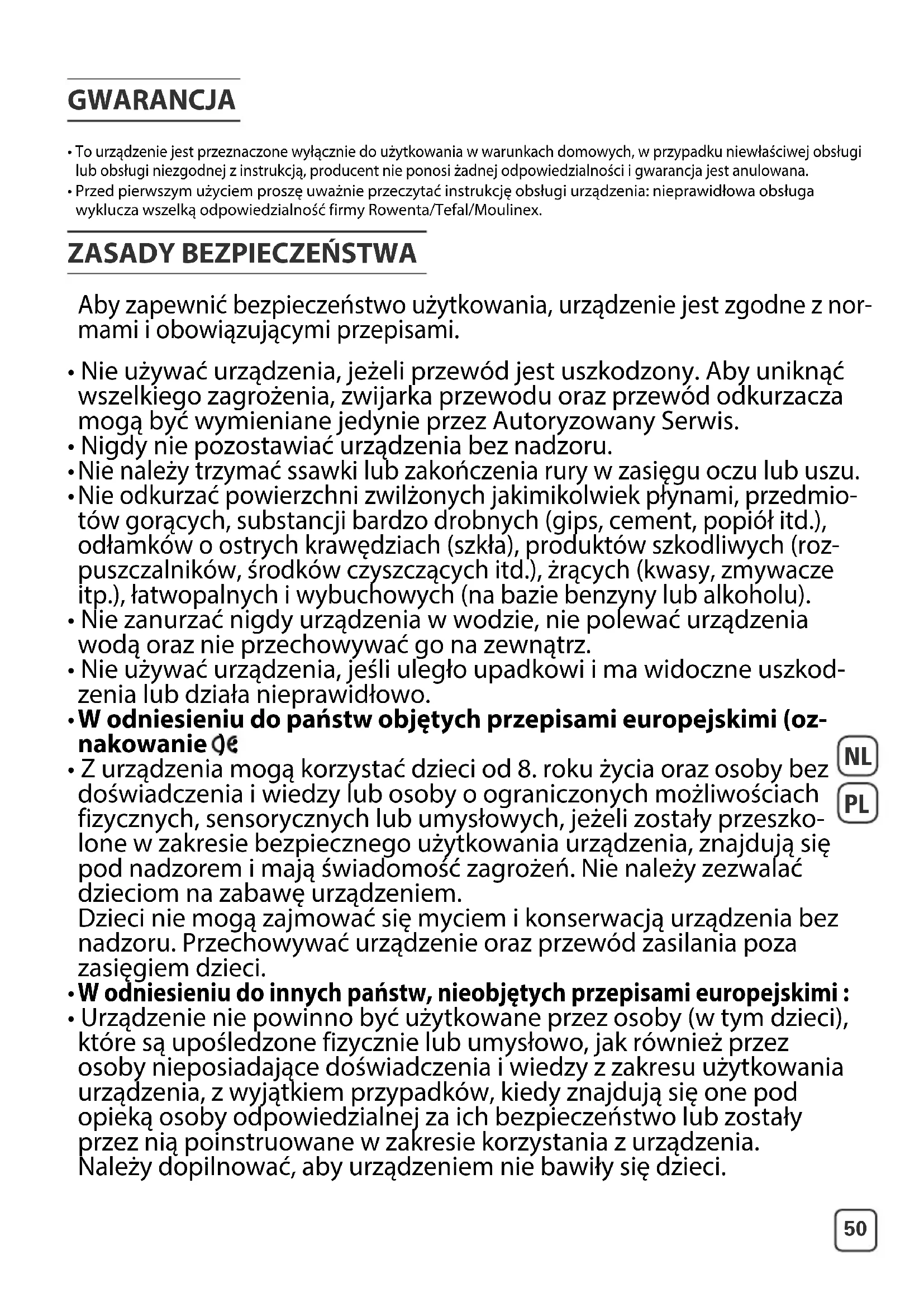 - Przed pierwszym użyciem proszę uważnie przeczytać instrukcję obsługi urządzenia: nieprawidłowa obsługa wyklucza wszelką odpowiedzialność firmy Rowenta/Tefal/Moulinex.