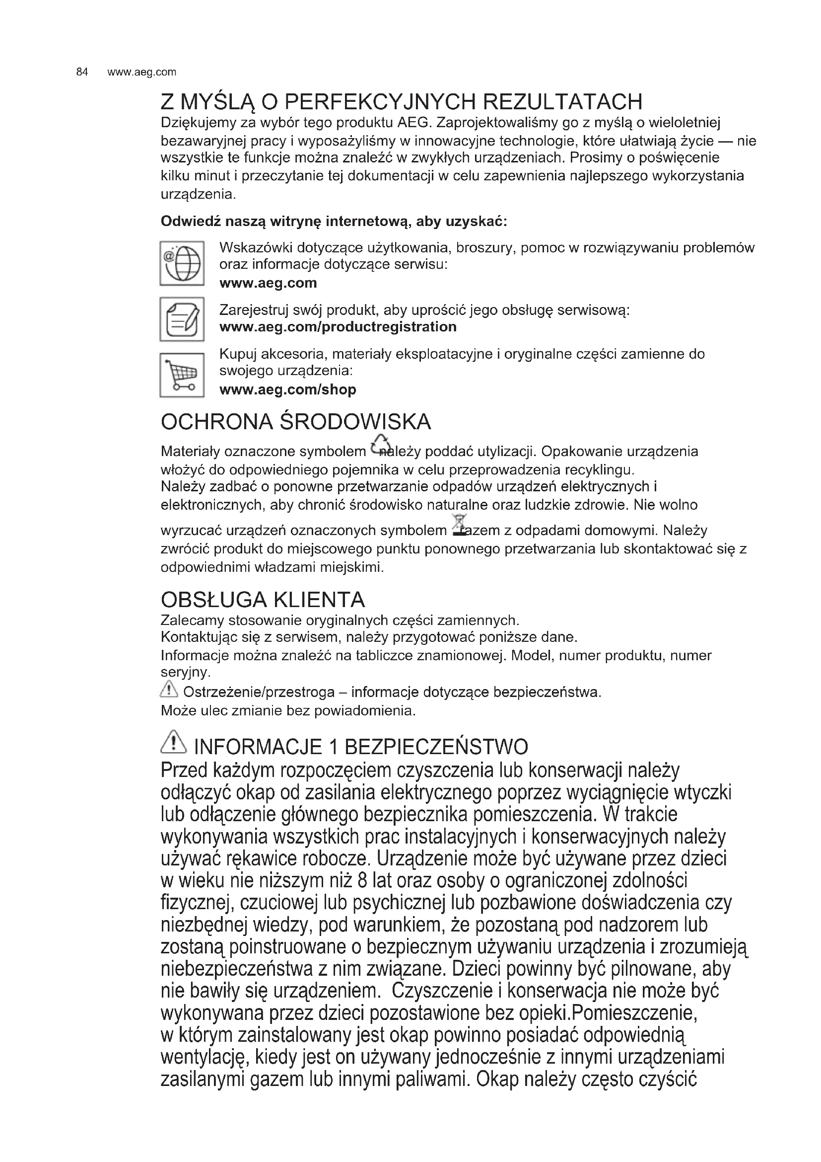 Dziękujemy za wybór tego produktu AEG. Zaprojektowaliśmy go z myślą o wieloletniej bezawaryjnej pracy i wyposażyliśmy w innowacyjne technologie, które ułatwiają życie — nie wszystkie te funkcje można znaleźć w zwykłych urządzeniach. Prosimy o poświęcenie kilku minut i przeczytanie tej dokumentacji w celu zapewnienia najlepszego wykorzystania urządzenia. Odwiedź naszą witrynę internetową, aby uzyskać: Wskazówki dotyczące użytkowania, broszury, pomoc w rozwiązywaniu problemów oraz informacje dotyczące serwisu: www.aeg.com Zarejestruj swój produkt, aby uprościć jego obsługę serwisową: www.aeg.com/productregistration Kupuj akcesoria, materiały eksploatacyjne i oryginalne części zamienne do swojego urządzenia: www.aeg.com/shop OCHRONA ŚRODOWISKA Materiały oznaczone symbolem należy poddać utylizacji. Opakowanie urządzenia włożyć do odpowiedniego pojemnika w celu przeprowadzenia recyklingu. Należy zadbać o ponowne przetwarzanie odpadów urządzeń elektrycznych i elektronicznych, aby chronić środowisko naturalne oraz ludzkie zdrowie. Nie wolno wyrzucać urządzeń oznaczonych symbolem razem z odpadami domowymi. Należy zwrócić produkt do miejscowego punktu ponownego przetwarzania lub skontaktować się z odpowiednimi władzami miejskimi.
