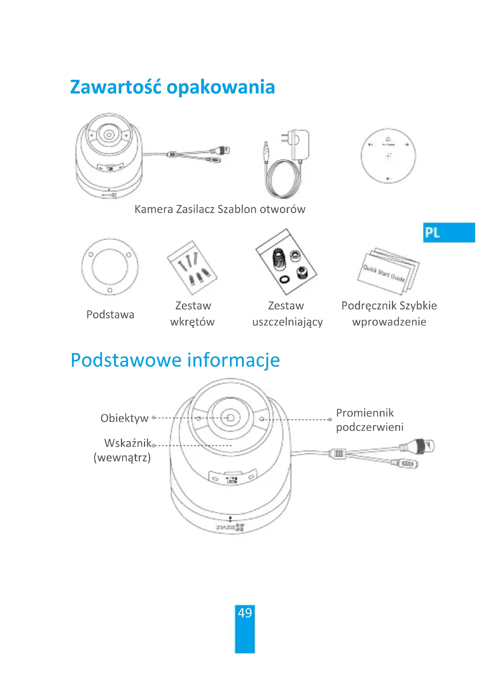 Draai de draaiknop los. Draai de camera zoals weergegeven in de aeelding. Voor meer informae, raadpleegt u www.ezvizlife.com.49 Kamera Zasilacz Szablon otworów Podstawa Zestaw wkrętów Zestaw uszczelniający Podręcznik Szybkie wprowadzenie Podstawowe informacje Wskaźnik (wewnątrz) Promiennik podczerwieni Obiektyw Zawartość opakowania50 Przycisk resetowania Gniazdo karty microSD Złącze sieciowe Złącze zasilania Nazwa Opis Promiennik podczerwieni Promiennik podczerwieni jest włączany automatycznie w warunkach słabego oświetlenia. Dzięki niemu obraz staje się bardziej wyraźny. Wskaźnik • Włączony (czerwony): kamera jest uruchamiana.