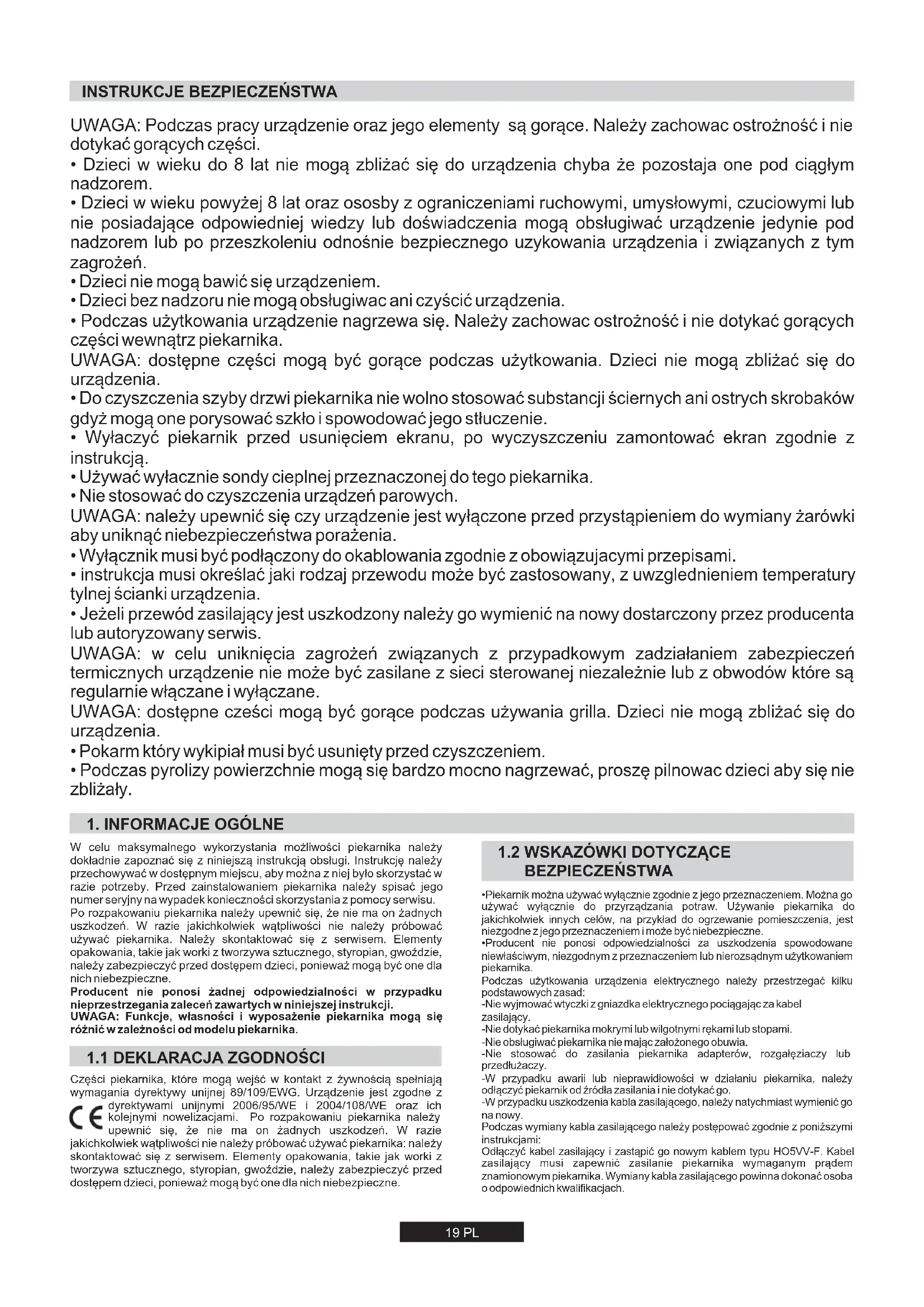 - Aby zapobiec nadmiernemu zabrudzeniu się piekarnika i wydzielaniu się powstającego wskutek tego dymu, należy unikać stosowania zbyt wysokich temperatur podczas pieczenia. Zaleca się raczej przedłużyć czas pieczenia i nieco obniżyć temperaturę pieczenia. Przewód uziemiający (żółto-zielony) musi być 10 mm dłuższy od przewodów zasilających. Naprawy piekarnika należy powierzać wyłącznie autoryzowanemu serwisowi, zapewniającemu stosowanie wyłącznie oryginalnych części zamiennych. W przypadku nieprzestrzegania powyższych instrukcji, producent nie może zagwarantować bezpieczeństwa użytkowania piekarnika.