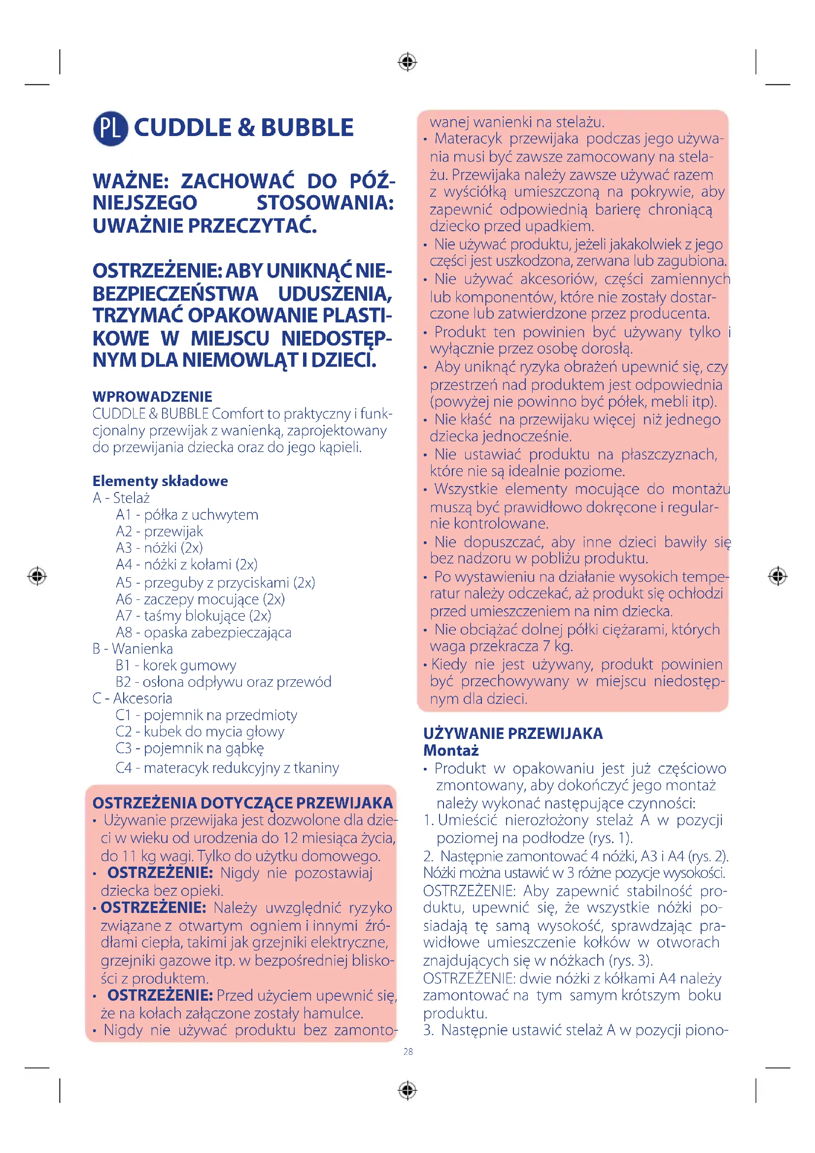 NYM DLA NIEMOWLĄT I DZIECI. WPROWADZENIE CUDDLE & BUBBLE Comfort to praktyczny i funk-cjonalny przewijak z wanienką, zaprojektowany do przewijania dziecka oraz do jego kąpieli.Elementy składowe A - Stelaż A1 - półka z uchwytemA2 - przewijakA3 - nóżki (2x)A4 - nóżki z kołami (2x)A5 - przeguby z przyciskami (2x)A6 - zaczepy mocujące (2x)A7 - taśmy blokujące (2x)A8 - opaska zabezpieczającaB - Wanienka B1 - korek gumowyB2 - osłona odpływu oraz przewódC - AkcesoriaC1 - pojemnik na przedmiotyC2 - kubek do mycia głowyC3 - pojemnik na gąbkęC4 - materacyk redukcyjny z tkaniny