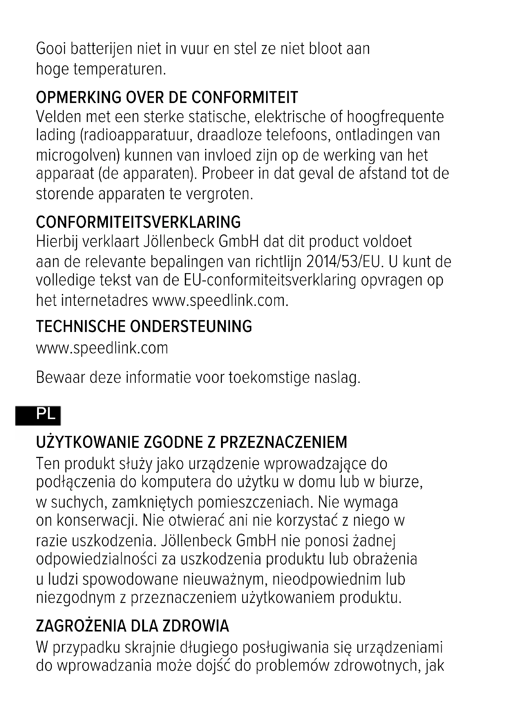 Jöllenbeck GmbH oświadcza niniejszym, że ten produkt jest zgodny z odnośnymi przepisami bezpieczeństwa dyrektywy 2014/53/UE. Kompletny tekst deklaracji zgodności można uzyskać na naszej stronie internetowej www.speedlink.com. POMOC TECHNICZNA www.speedlink.com Prosimy zachować tę informację do późniejszego wykorzystania.
