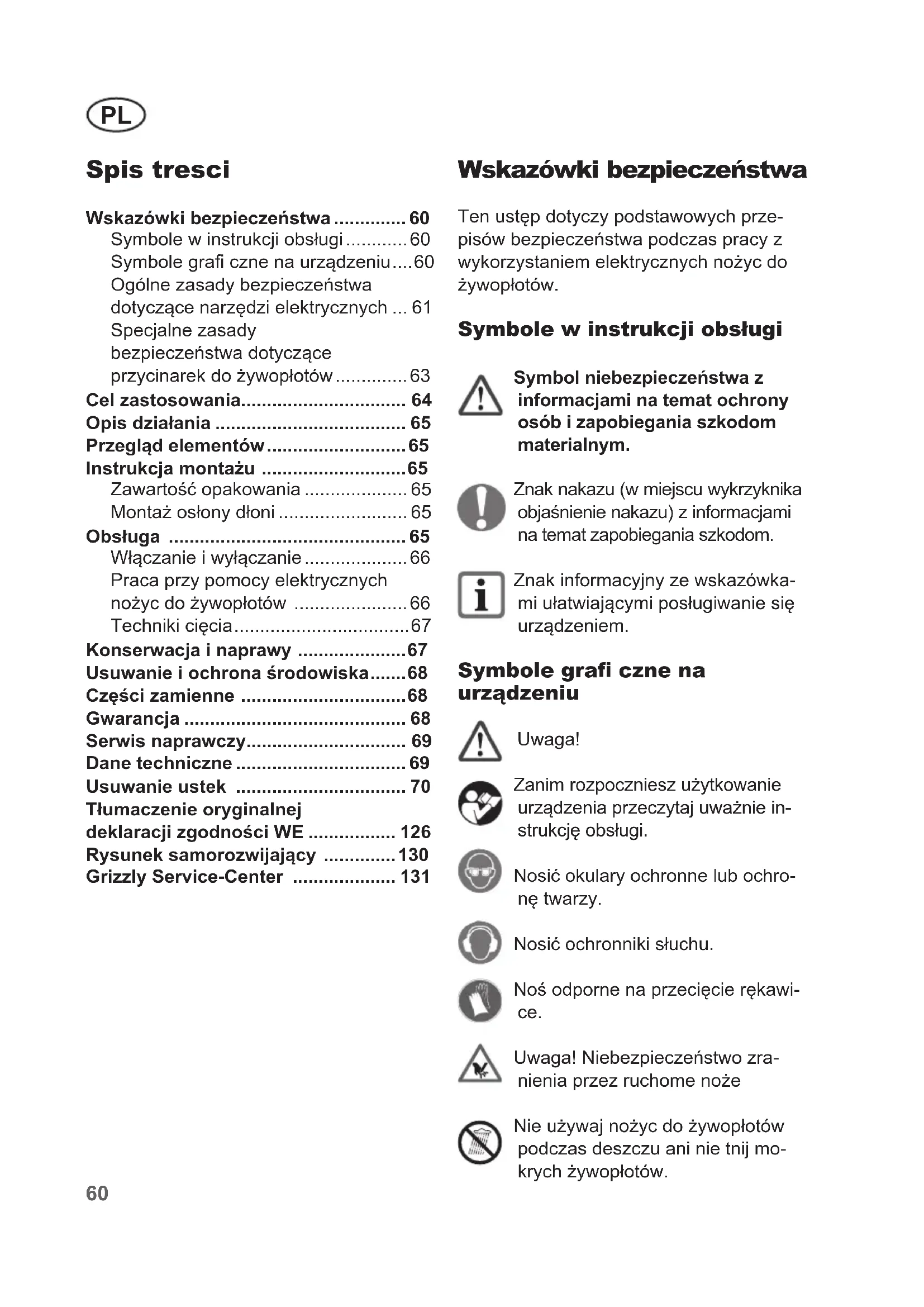 - Przechowuj nożyce do żywopłotów w załączonej osłonie noży w suchym, niedostępnym dla dzieci miejscu. Usuwanie i ochrona środowiska Przekaż urządzenie, jego akcesoria i opa- kowanie do zgodnej z przepisami o ochro- nie środowiska naturalnego utylizacji. Urządzeń elektrycznych nie należy wyrzucać razem z odpadami domo- wymi Oddaj urządzenie w punkcie recy-klingu. Użyte do produkcji urządzenia części plastikowe i metalowe mogą zostać od siebie precyzyjnie oddzielone, a następnie poddane utylizacji. Zwróć się po poradę do naszego Centrum Serwisowego. Części zamienne Części zamienne i akcesoria można zakupić na www.grizzly-service.eu Jeżeli nie masz dostępu do Internetu, skontaktuj się z Centrum Serwisowym (patrz „ Grizzly Service-Center „). Przy zamawianiu części koniecznie podaj typ maszyny i numer pozycji na rysunku sa- morozwijającym. Gwarancja Udzielamy 24-miesięcznej gwarancji na to urządzenie. To urządzenie nie jest przeznaczone do zastosowania komercyjnego. W przypad- ku użytkowania komercyjnego wygasają prawa z tytułu gwarancji. Szkody, które są wynikiem natu-ralnego zużycia, przeciążenia lub niewłaści-wej obsługi urządzenia, nie podlegają gwa- -rancji. Określone części urządzenia ule- gają naturalnemu zużyciu a tym samym nie pod-legają gwarancji. Zaliczają się do nich przede wszystkim listwy nożowe, mimośród i szczotki węglowe, o ile uszko- dzenia nie wynikają z wad materiałowych. Warunkiem świadczeń gwarancyjnych jest ponadto przestrzeganie wskazówek dotyczących czyszczenia i kon-serwacji, zamieszczonych w tej instrukcji obsługi, Uszkodzenia, które powstały w wyniku wad produkcyjnych lub materiałowych usu- -wane będą bezpłatnie w formie zamiany lub naprawy. Warunkiem jest dostarczenie urząd-zenia do sprzedawcy w stanie nie rozłożonym z dowodem zakupu i gwaran- cji.69
