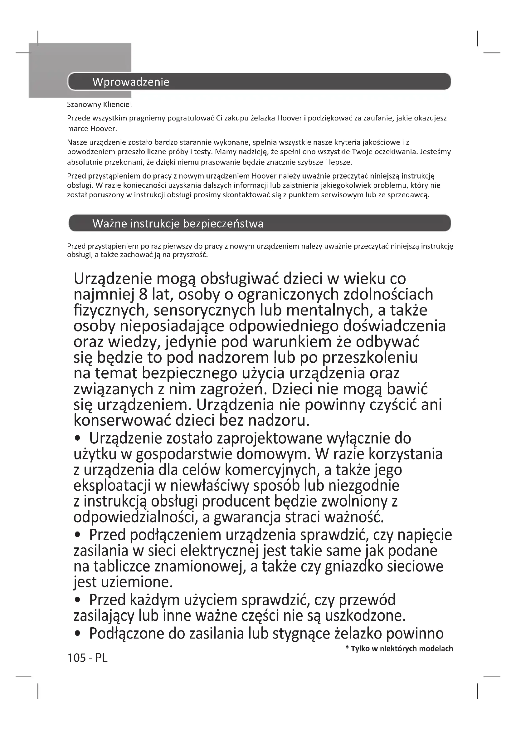 - Tylko w niektórych modelach Wprowadzenie Szanowny Kliencie! Przede wszystkim pragniemy pogratulować Ci zakupu żelazka Hoover i podziękować za zaufanie, jakie okazujesz marce Hoover. Nasze urządzenie zostało bardzo starannie wykonane, spełnia wszystkie nasze kryteria jakościowe i z powodzeniem przeszło liczne próby i testy. Mamy nadzieję, że spełni ono wszystkie Twoje oczekiwania. Jesteśmy absolutnie przekonani, że dzięki niemu prasowanie będzie znacznie szybsze i lepsze. Przed przystąpieniem do pracy z nowym urządzeniem Hoover należy uważnie przeczytać niniejszą instrukcję obsługi. W razie konieczności uzyskania dalszych informacji lub zaistnienia jakiegokolwiek problemu, który nie został poruszony w instrukcji obsługi prosimy skontaktować się z punktem serwisowym lub ze sprzedawcą. Ważne instrukcje bezpieczeństwa Przed przystąpieniem po raz pierwszy do pracy z nowym urządzeniem należy uważnie przeczytać niniejszą instrukcję obsługi, a także zachować ją na przyszłość. Urządzenie mogą obsługiwać dzieci w wieku co najmniej 8 lat, osoby o ograniczonych zdolnościach zycznych, sensorycznych lub mentalnych, a także osoby nieposiadające odpowiedniego doświadczenia oraz wiedzy, jedynie pod warunkiem że odbywać się będzie to pod nadzorem lub po przeszkoleniu na temat bezpiecznego użycia urządzenia oraz związanych z nim zagrożeń. Dzieci nie mogą bawić się urządzeniem. Urządzenia nie powinny czyścić ani konserwować dzieci bez nadzoru.