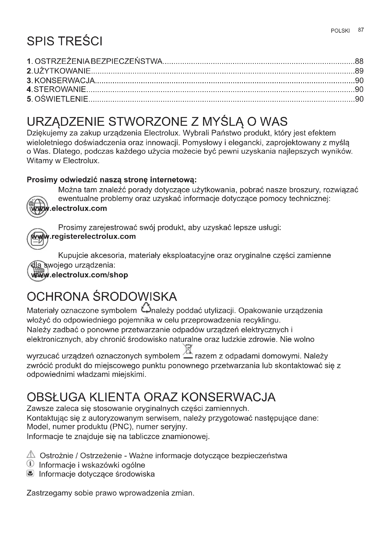- 5. OŚWIETLENIE URZĄDZENIE STWORZONE Z MYŚLĄ O WAS Dziękujemy za zakup urządzenia Electrolux. Wybrali Państwo produkt, który jest efektem wieloletniego doświadczenia oraz innowacji. Pomysłowy i elegancki, zaprojektowany z myślą o Was. Dlatego, podczas każdego użycia możecie być pewni uzyskania najlepszych wyników. Witamy w Electrolux. Prosimy odwiedzić naszą stronę internetową: Można tam znaleźć porady dotyczące użytkowania, pobrać nasze broszury, rozwiązać ewentualne problemy oraz uzyskać informacje dotyczące pomocy technicznej: www.electrolux.com Prosimy zarejestrować swój produkt, aby uzyskać lepsze usługi: www.registerelectrolux.com Kupujcie akcesoria, materiały eksploatacyjne oraz oryginalne części zamienne dla swojego urządzenia: www.electrolux.com/shop OCHRONA ŚRODOWISKA Materiały oznaczone symbolem należy poddać utylizacji. Opakowanie urządzenia włożyć do odpowiedniego pojemnika w celu przeprowadzenia recyklingu. Należy zadbać o ponowne przetwarzanie odpadów urządzeń elektrycznych i elektronicznych, aby chronić środowisko naturalne oraz ludzkie zdrowie. Nie wolno wyrzucać urządzeń oznaczonych symbolem razem z odpadami domowymi. Należy zwrócić produkt do miejscowego punktu ponownego przetwarzania lub skontaktować się z odpowiednimi władzami miejskimi. p. 90