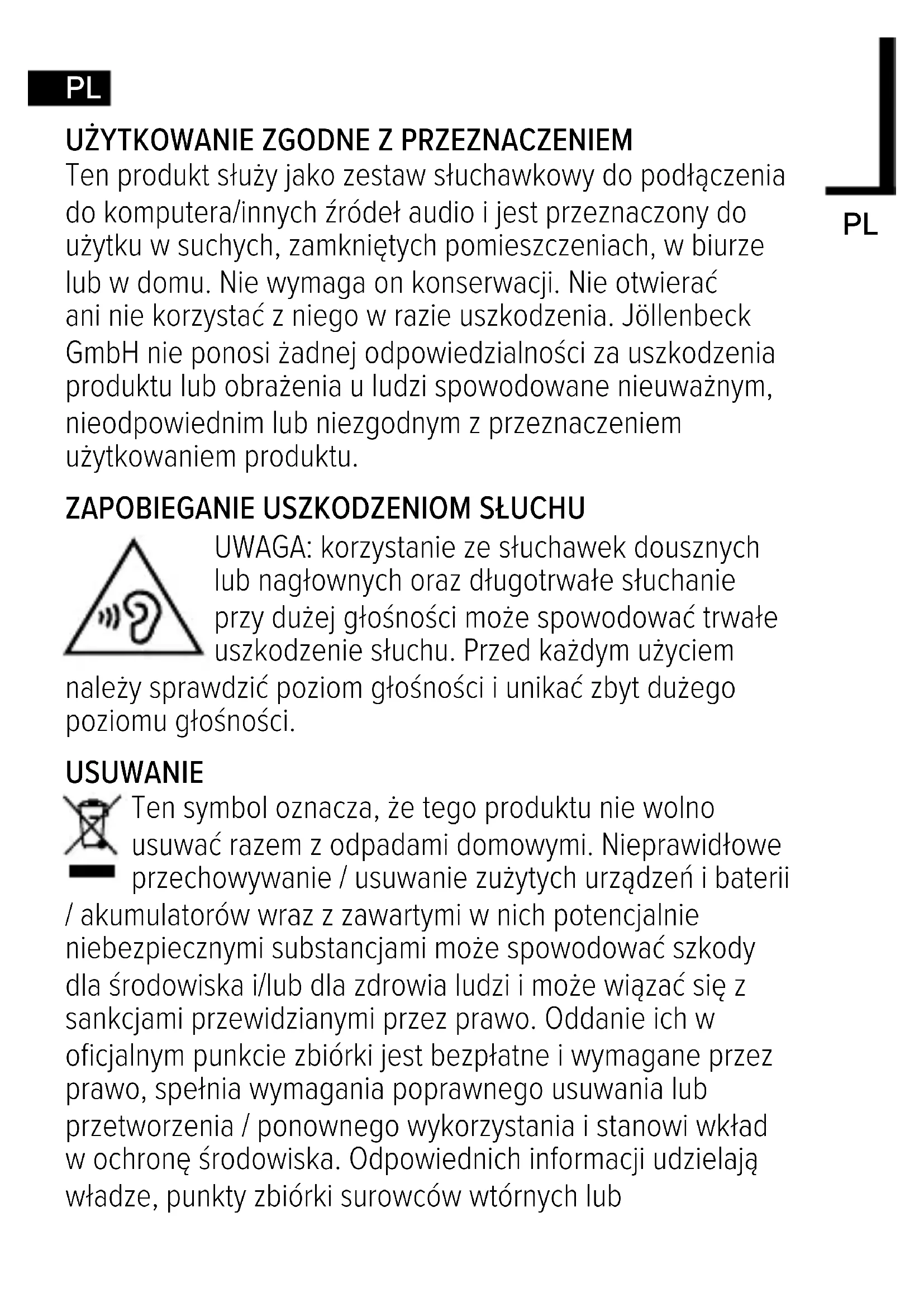 Ten produkt służy jako zestaw słuchawkowy do podłączenia do komputera/innych źródeł audio i jest przeznaczony do użytku w suchych, zamkniętych pomieszczeniach, w biurze lub w domu. Nie wymaga on konserwacji. Nie otwierać ani nie korzystać z niego w razie uszkodzenia. Jöllenbeck GmbH nie ponosi żadnej odpowiedzialności za uszkodzenia produktu lub obrażenia u ludzi spowodowane nieuważnym, nieodpowiednim lub niezgodnym z przeznaczeniem użytkowaniem produktu.